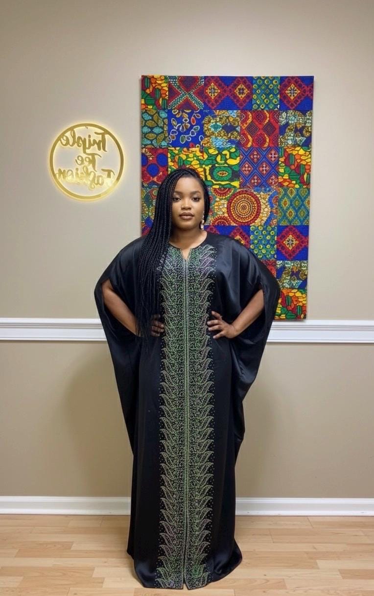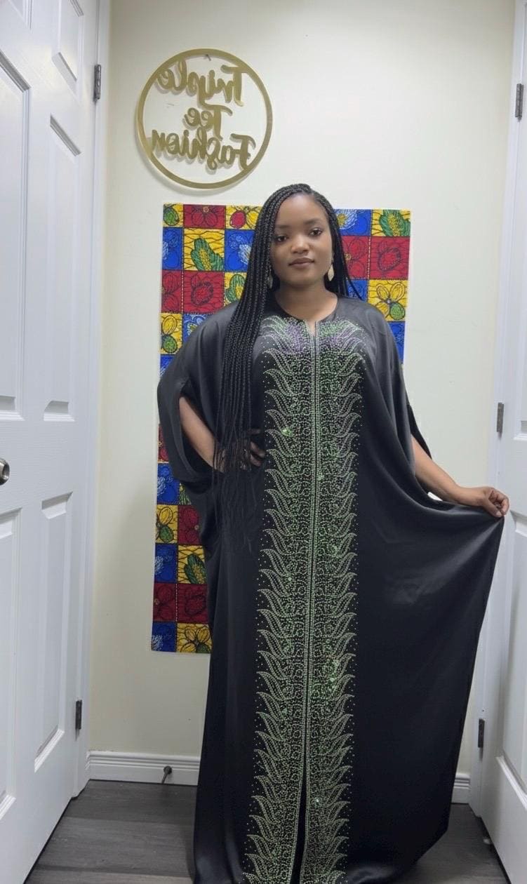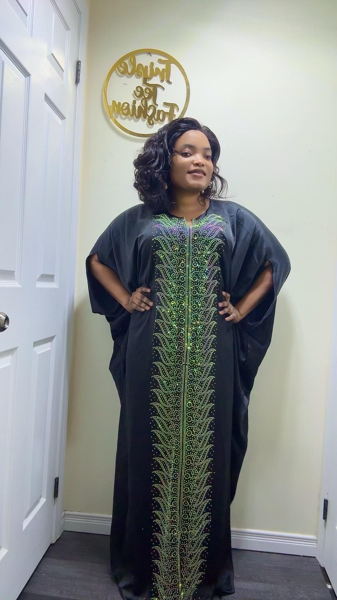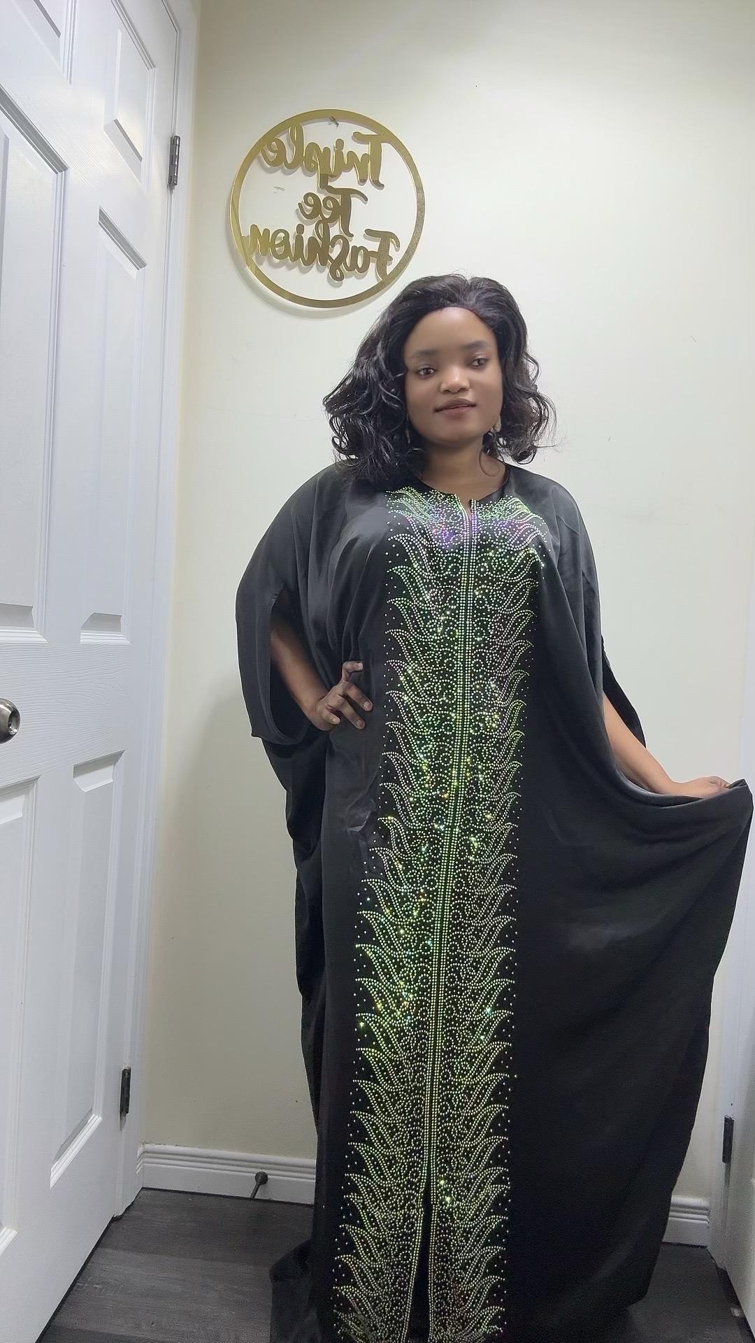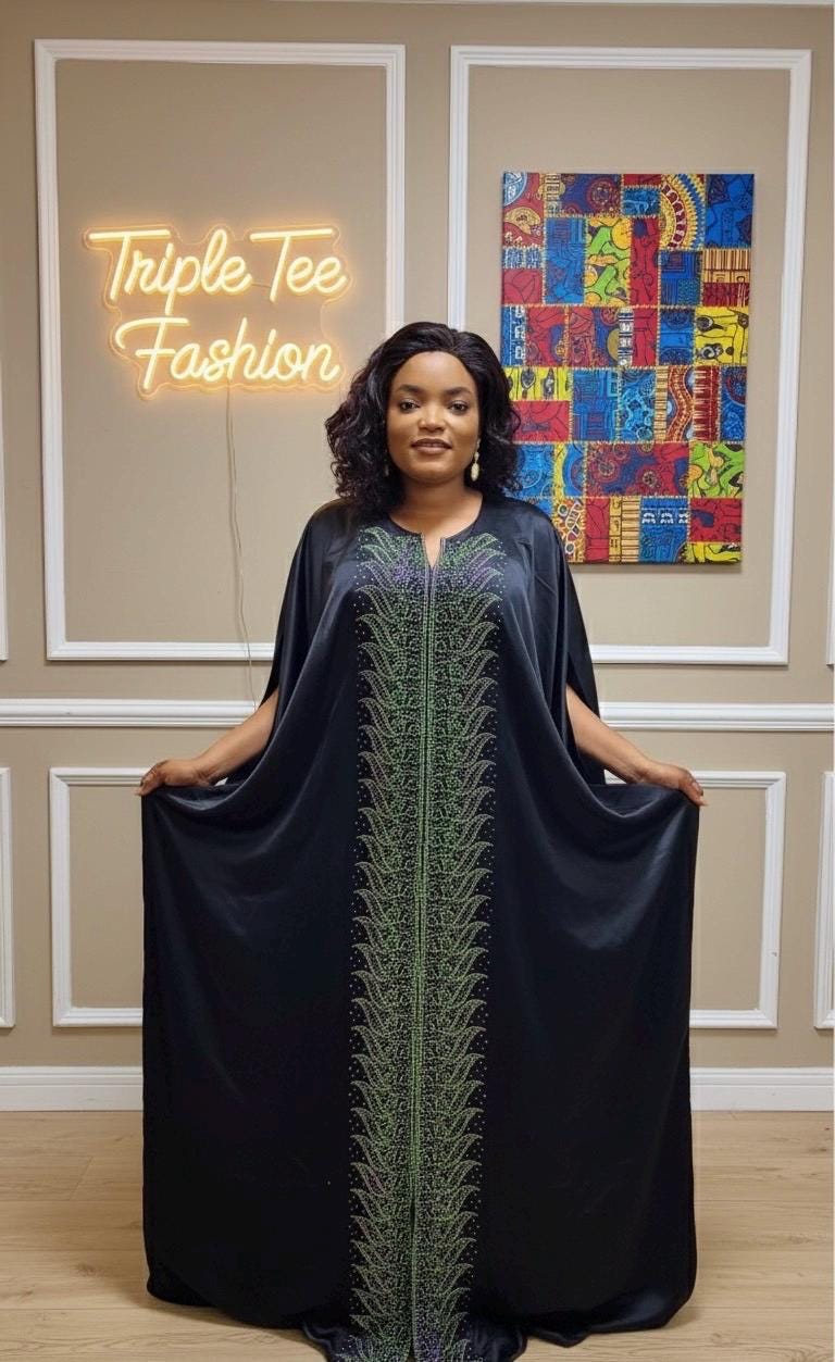 This beautiful dress is an irregular shaped boubou with an inner belt attached to make it fit. One size fits all. Can be worn in two ways; You can tie the inner belt to make it fitted or leave it as a boubou.