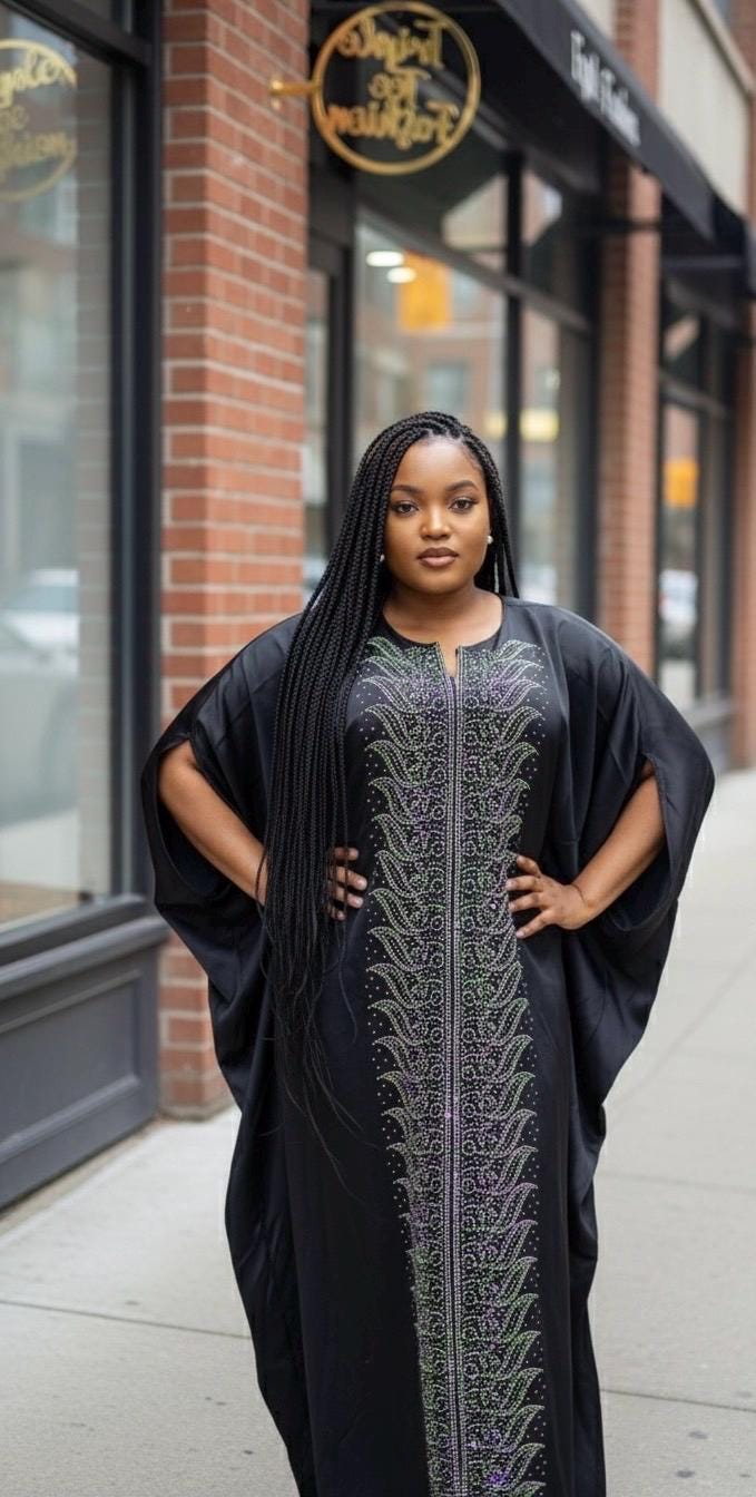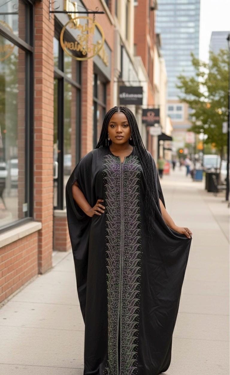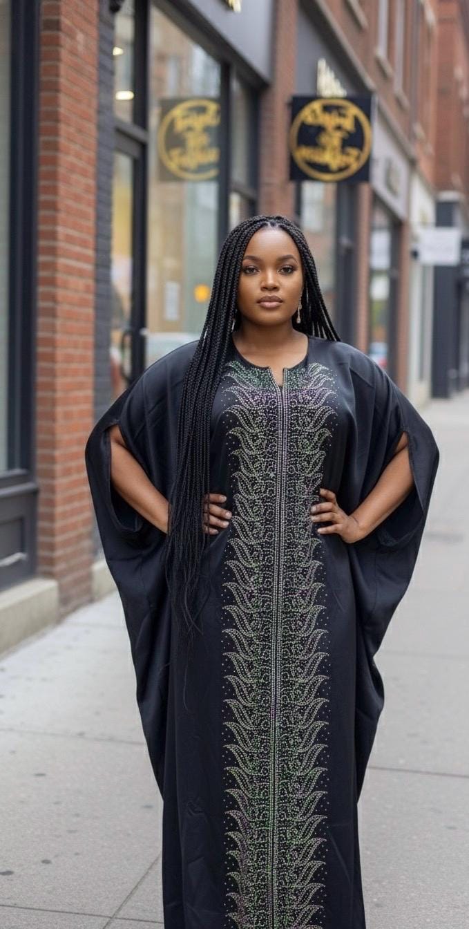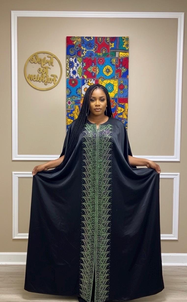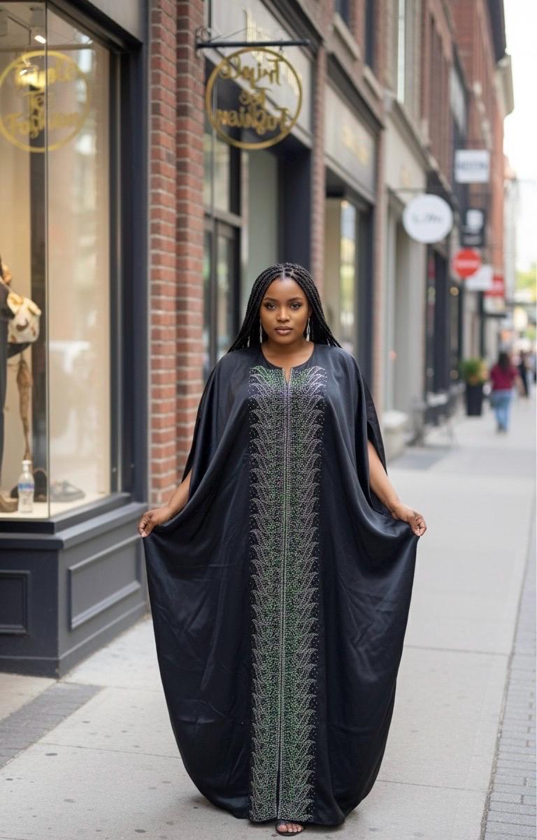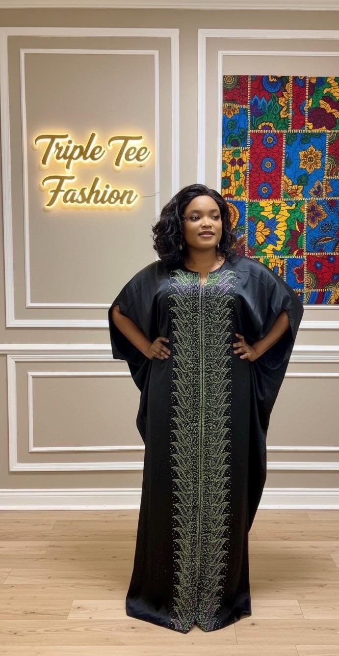 This beautiful dress is an irregular shaped boubou with an inner belt attached to make it fit. One size fits all. Can be worn in two ways; You can tie the inner belt to make it fitted or leave it as a boubou.