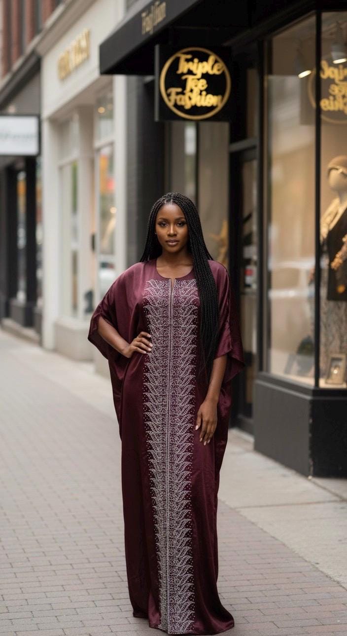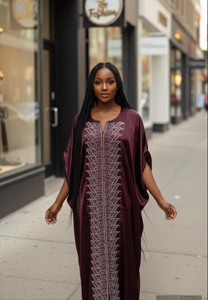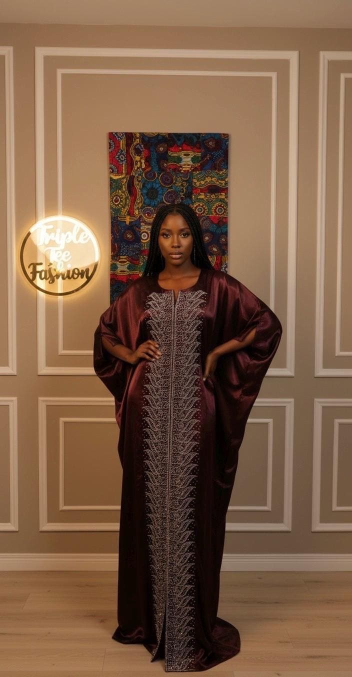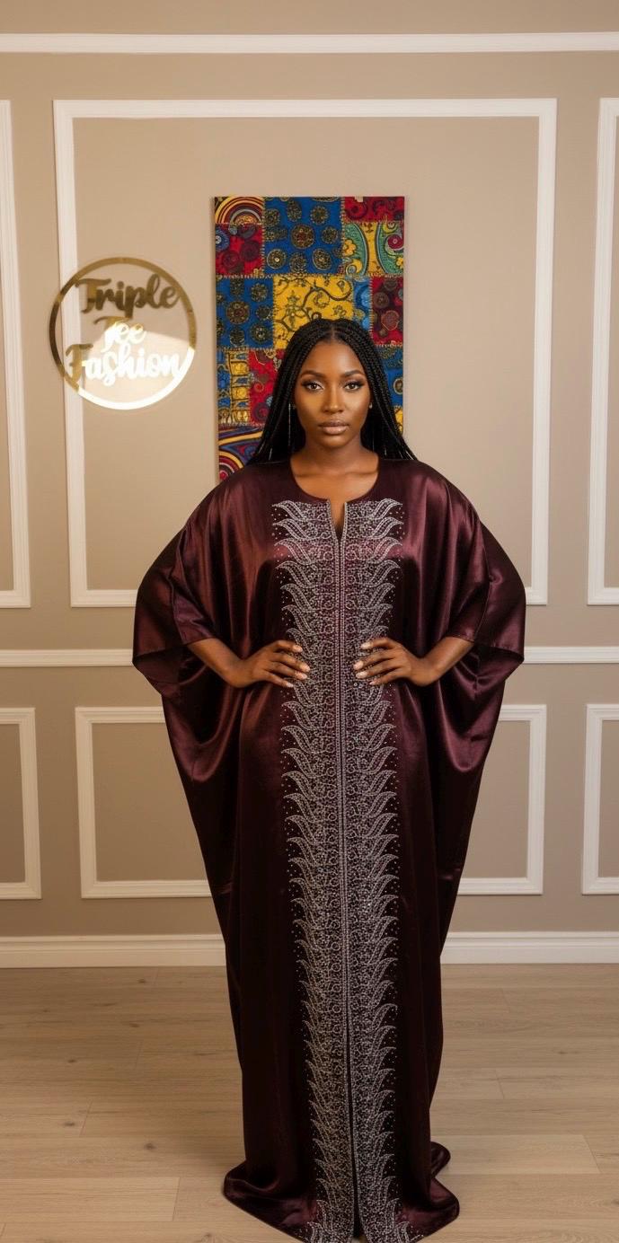 This beautiful dress is an irregular shaped boubou with an inner belt attached to make it fit. One size fits all. Can be worn in two ways; You can tie the inner belt to make it fitted or leave it as a boubou.