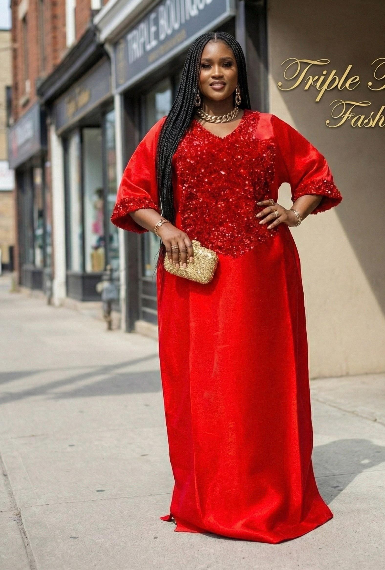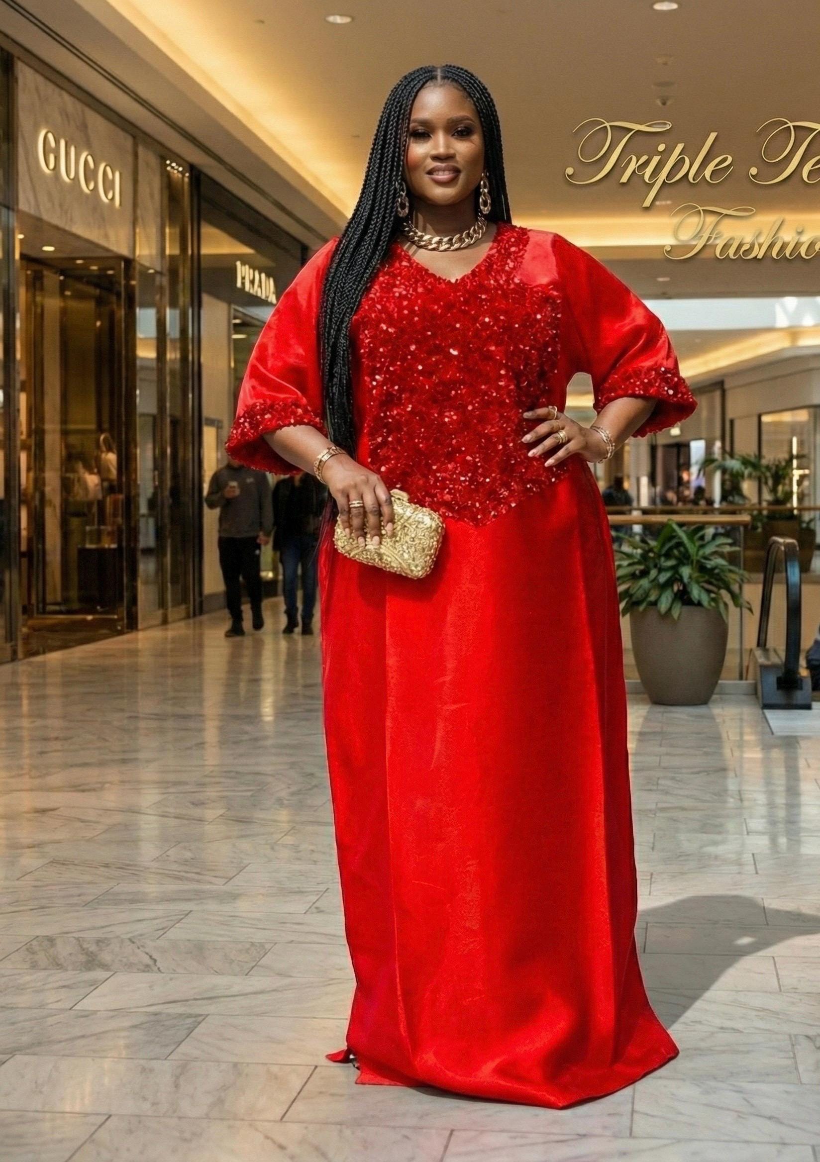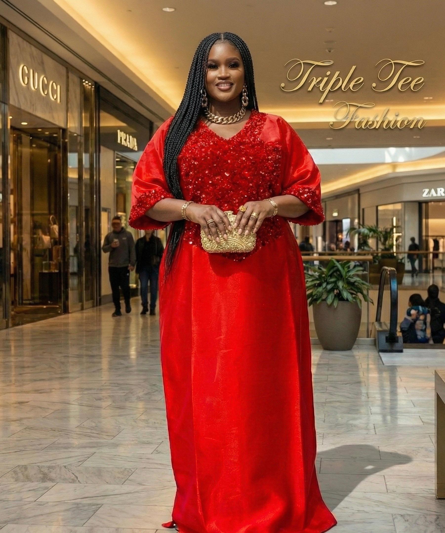Outfit description - Made from mikado and Sequence. One size fits US size 8 to Size 20, It is a free size boubou. Comes with a cap to match.