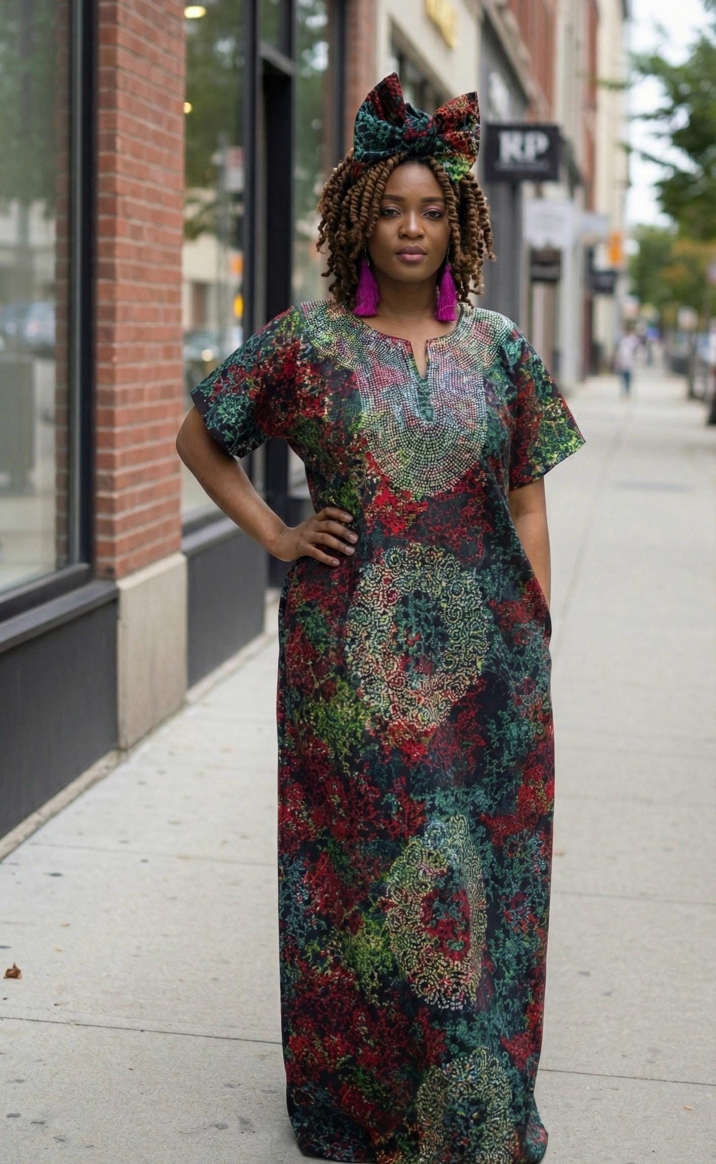 100% cotton. Made with African Ankara fabric. Crystal details. Blinged Ankara dress. Size 14, 16, 18 and 20 available. See photo for measurements. Lenght is 61 inches. Ready made dresses. Exactly as in the video. Comes with the cap