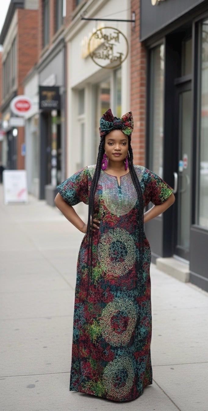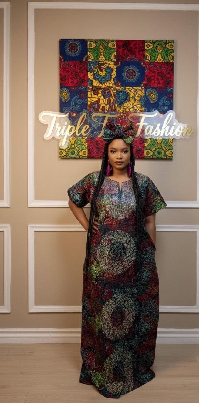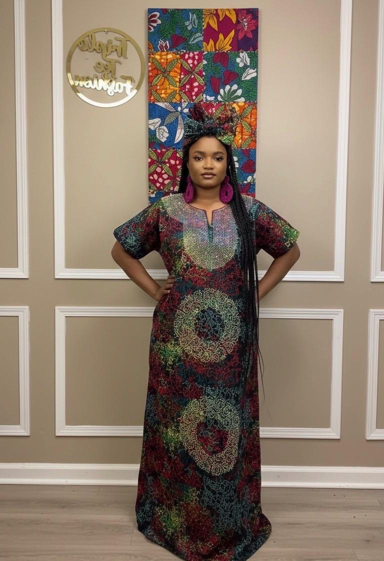 100% cotton. Made with African Ankara fabric. Crystal details. Blinged Ankara dress. Size 14, 16, 18 and 20 available. See photo for measurements. Lenght is 61 inches. Ready made dresses. Exactly as in the video. Comes with the cap