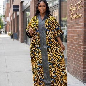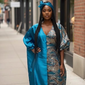 Our exquisite Mikado dress boubou, adorned with intricate black appliqué along the neckline for a striking contrast. Crafted to fit all sizes, its flowing design effortlessly combines comfort and glamour, making it the perfect choice for any fashion-forward individual.