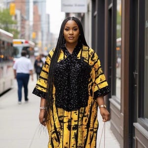 Outfit description - Made from mikado and aso oke. One size fits US size 8 to Size 20, It is a free size boubou. Comes with a cap to match.