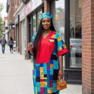 Outfit description - Made from mikado and Brocade. One size fits US size 8 to Size 24, It is a free size boubou. It has an inner belt to make it fitted. Comes with a scarf to match.