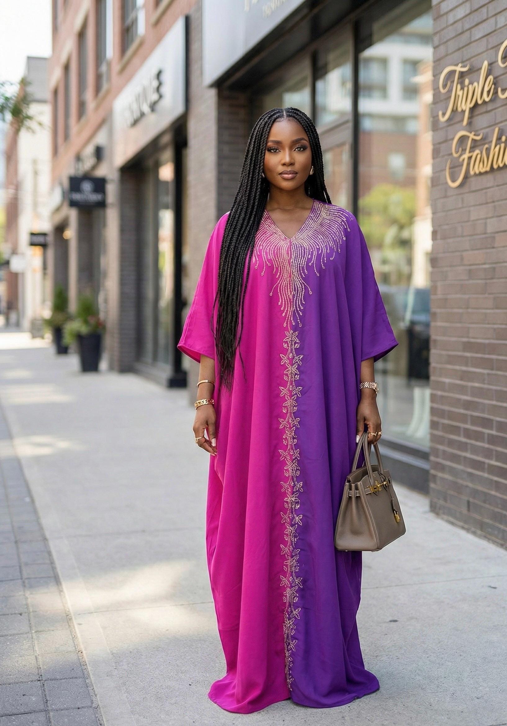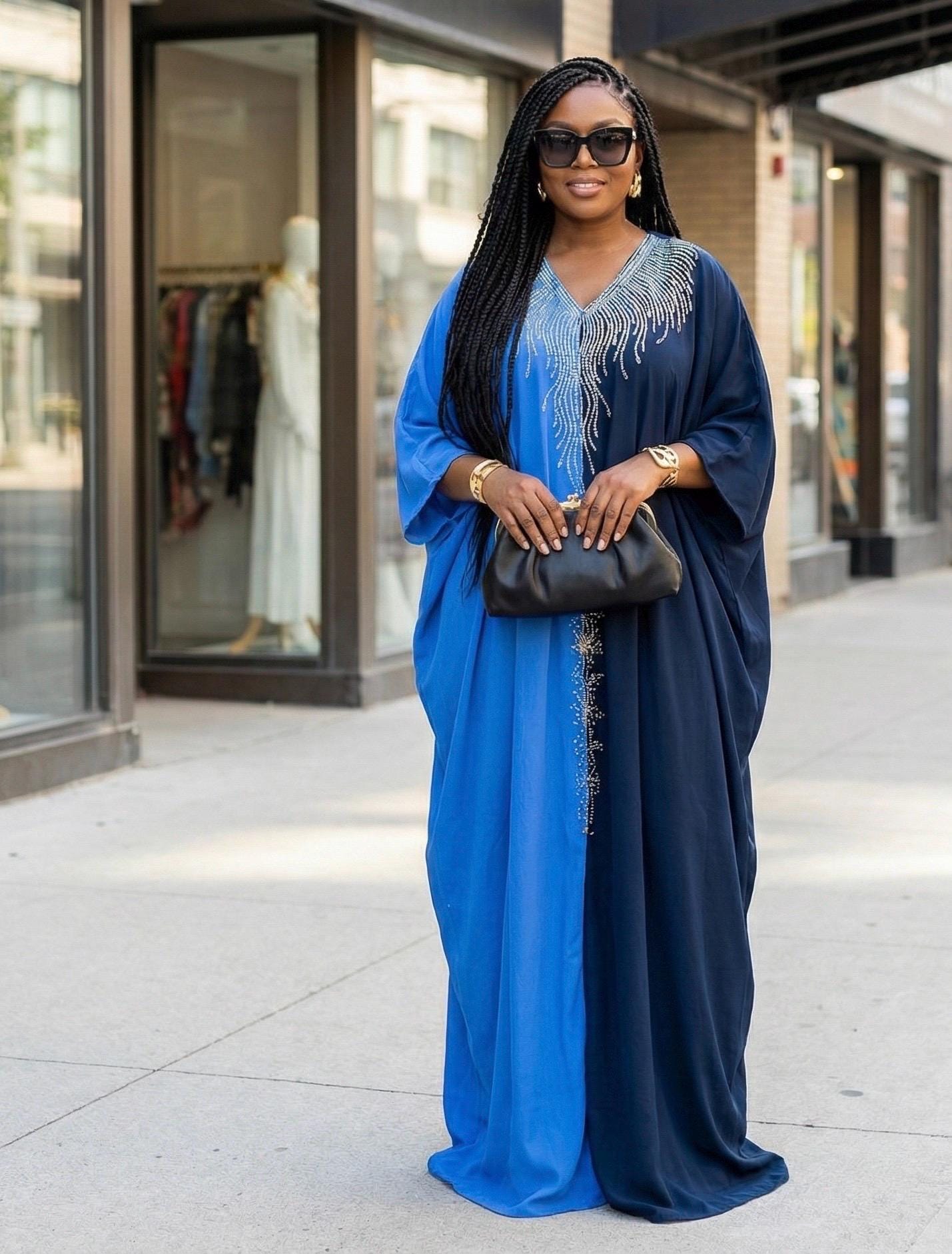 This beautiful dress is an irregular shaped boubou with an inner belt attached to make it fit. One size fits all. Can be worn in two ways; You can tie the inner belt to make it fitted or leave it as a boubou.