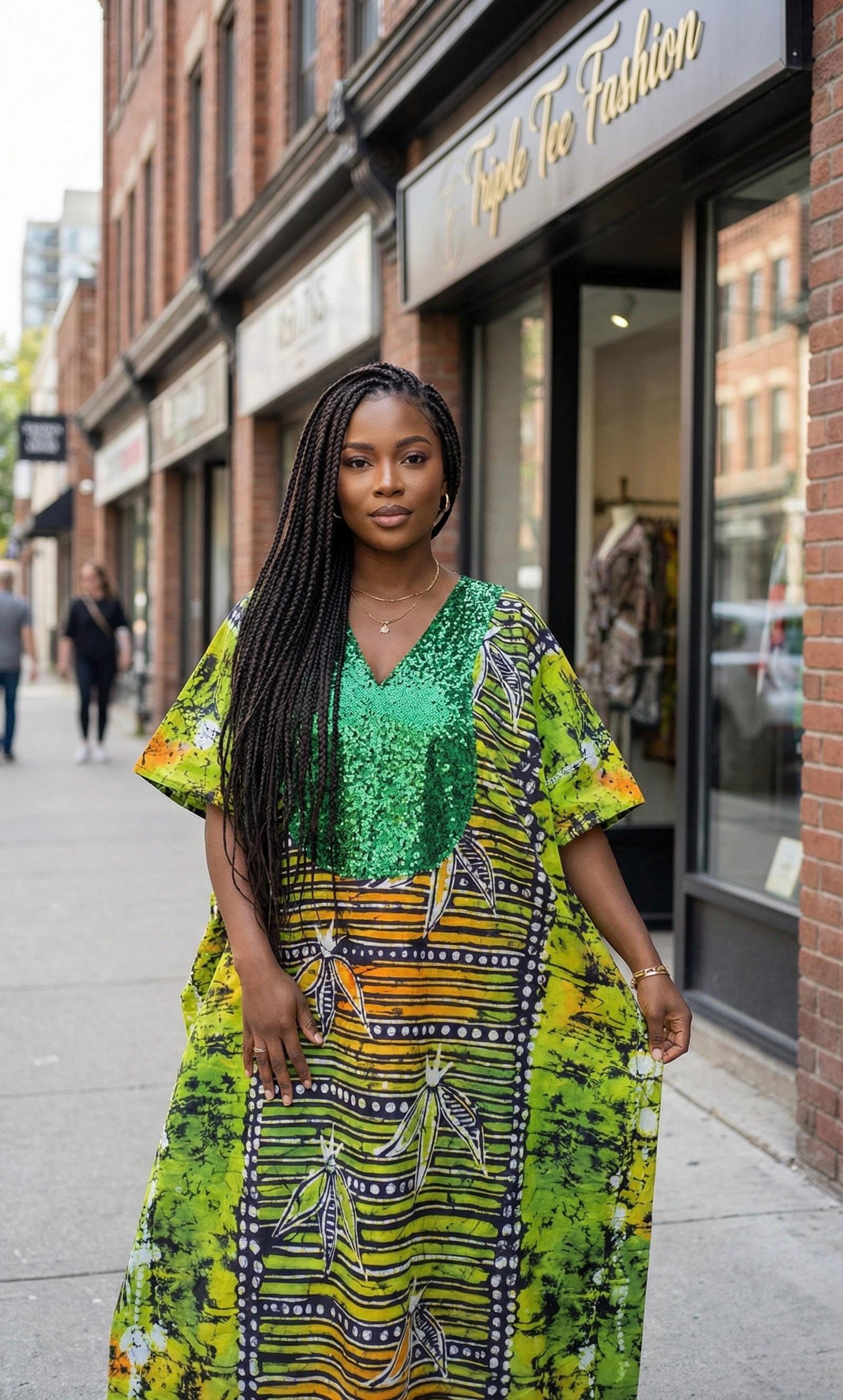 Our dazzling Kampala and sequins kaftan boubou, a fusion of vibrant African prints and glamorous embellishments.