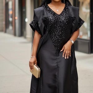 Our dazzling Kampala and sequins kaftan boubou, a fusion of vibrant African prints and glamorous embellishments.