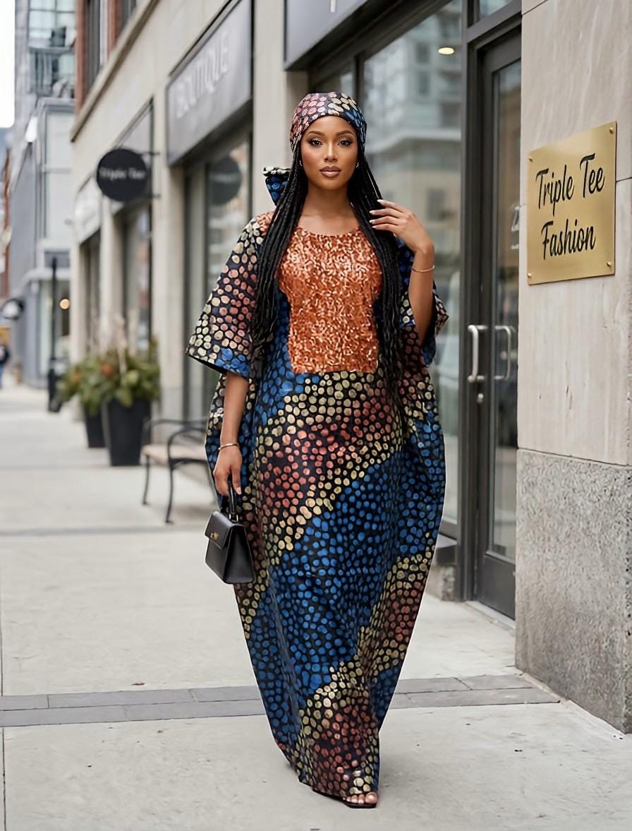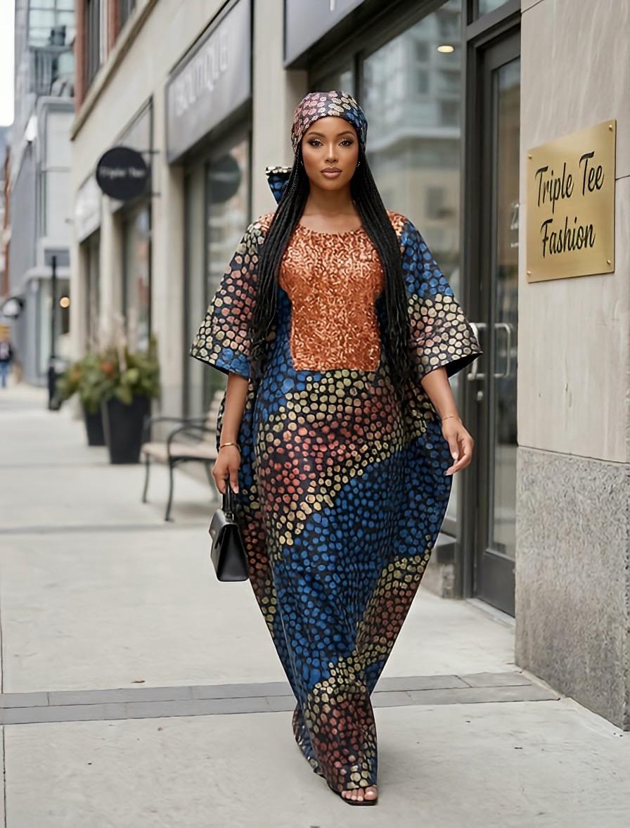 Our dazzling Kampala and sequins kaftan boubou, a fusion of vibrant African prints and glamorous embellishments.