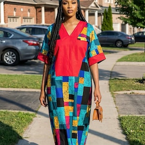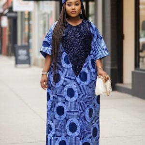 100% cotton. Made with African Ankara fabric. Perfectly embellished for a Queen and more! One size fits all. Ready made dresses.