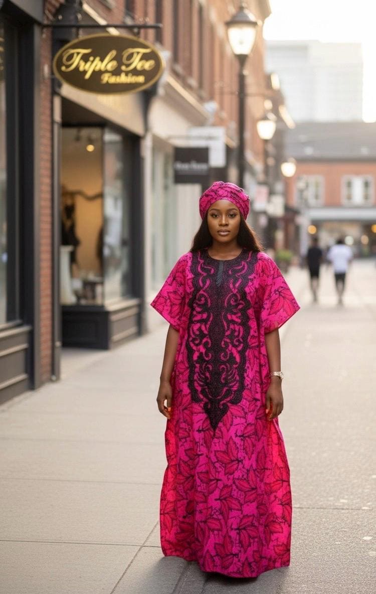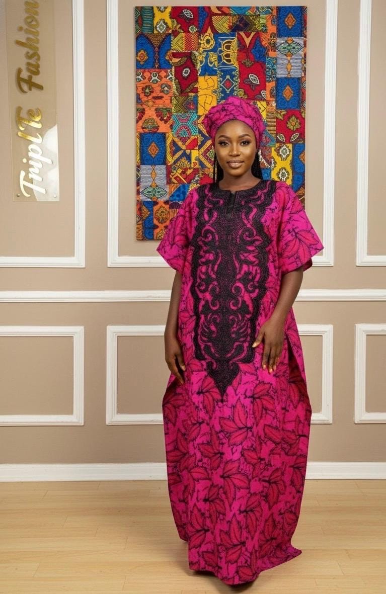 100% cotton. Made with African Ankara fabric. Perfectly embellished for a Queen and more! One size fits all. Ready made dresses.