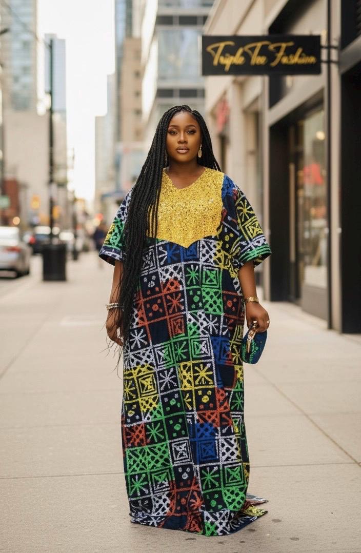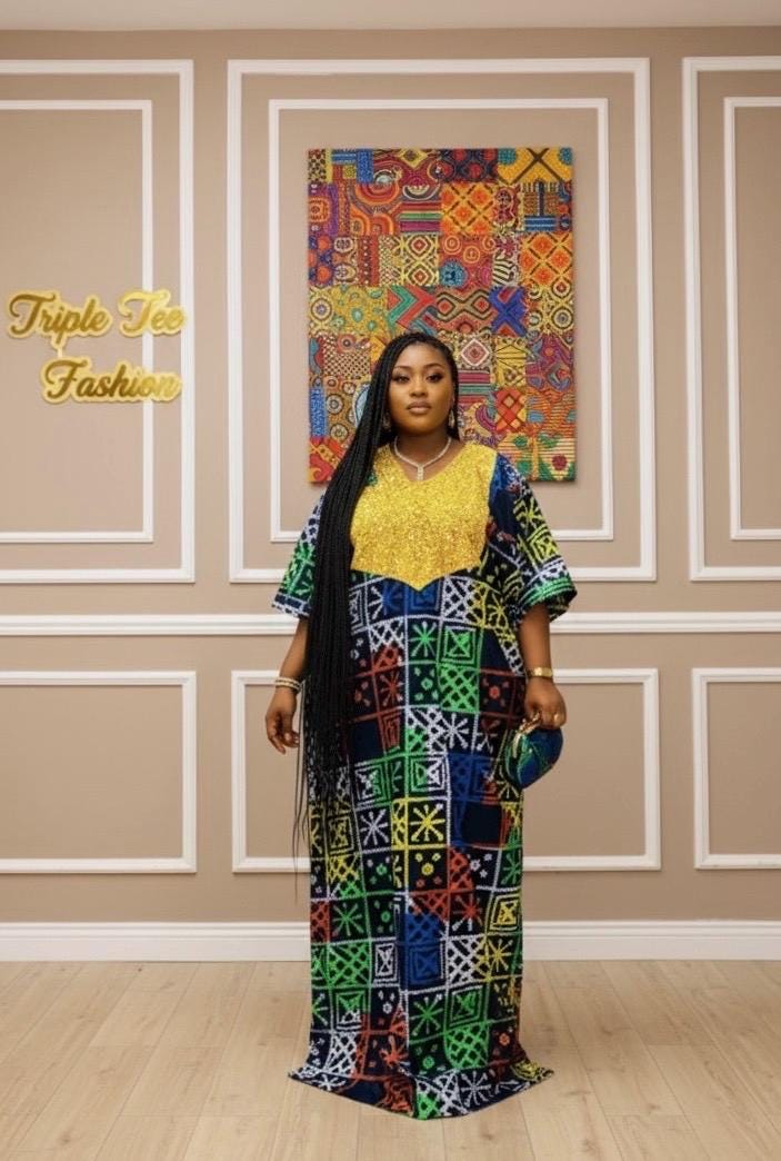 Our dazzling Kampala and sequins kaftan boubou, a fusion of vibrant African prints and glamorous embellishments.