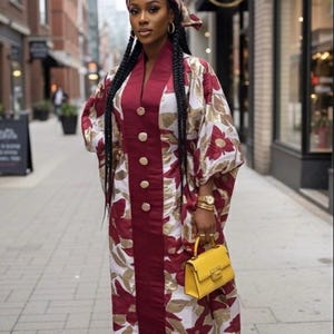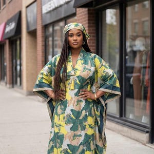 This mikado silk boubou is an elegant African kaftan featuring intricate embroidery along the neckline, adding a touch of sophistication and cultural flair to the garment.