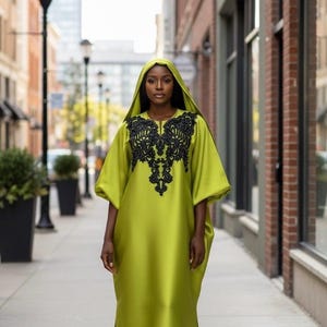 Crafted from luxurious mikado silk, this boubou offers a combination of comfort and style, perfect for special occasions or formal gatherings. The long embroidery on the neck enhances the traditional aesthetic of the kaftan, making it a standout piece in any wardrobe.