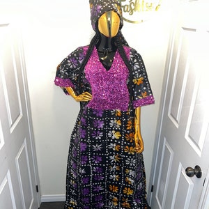 This mikado silk boubou is an elegant African kaftan featuring intricate embroidery along the neckline, adding a touch of sophistication and cultural flair to the garment.
