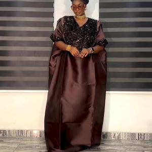 Outfit description - Made from mikado and Brocade. One size fits US size 8 to Size 24, It is a free size boubou. It has an inner belt to make it fitted. Comes with a scarf to match.
