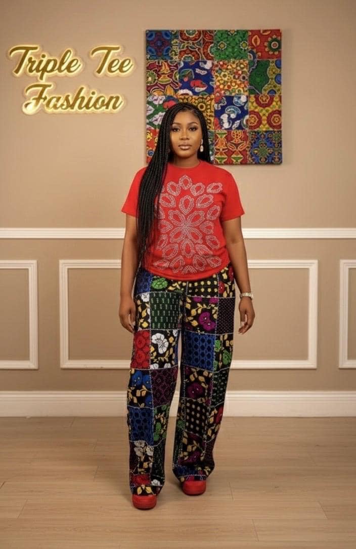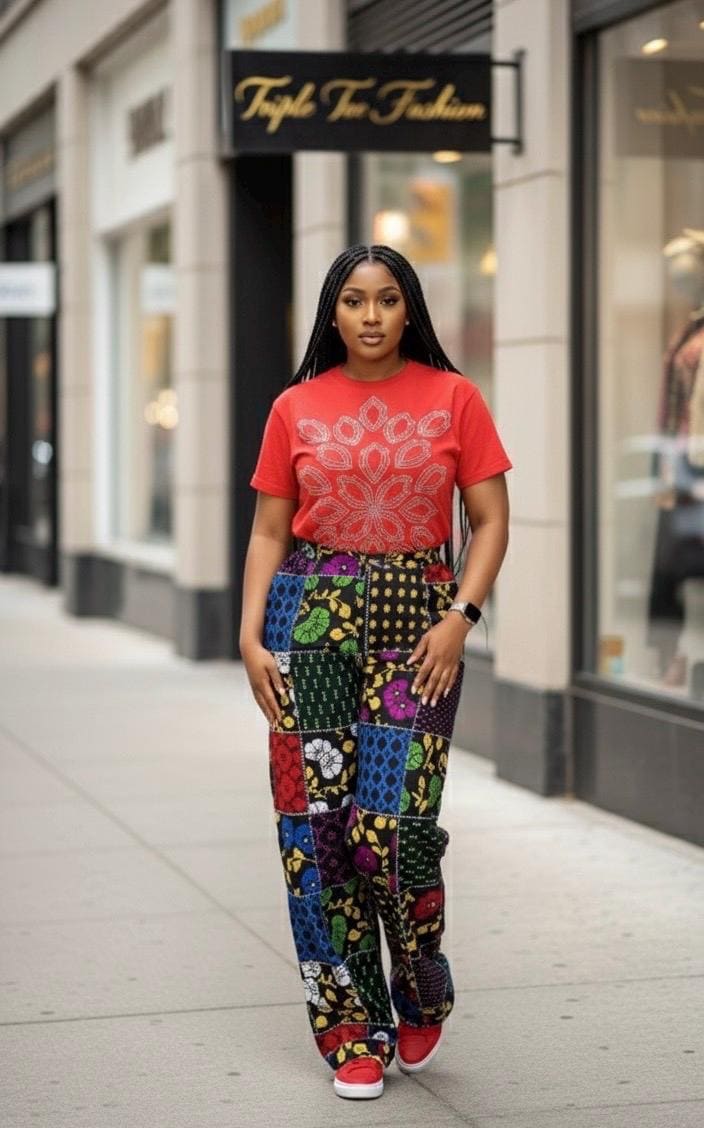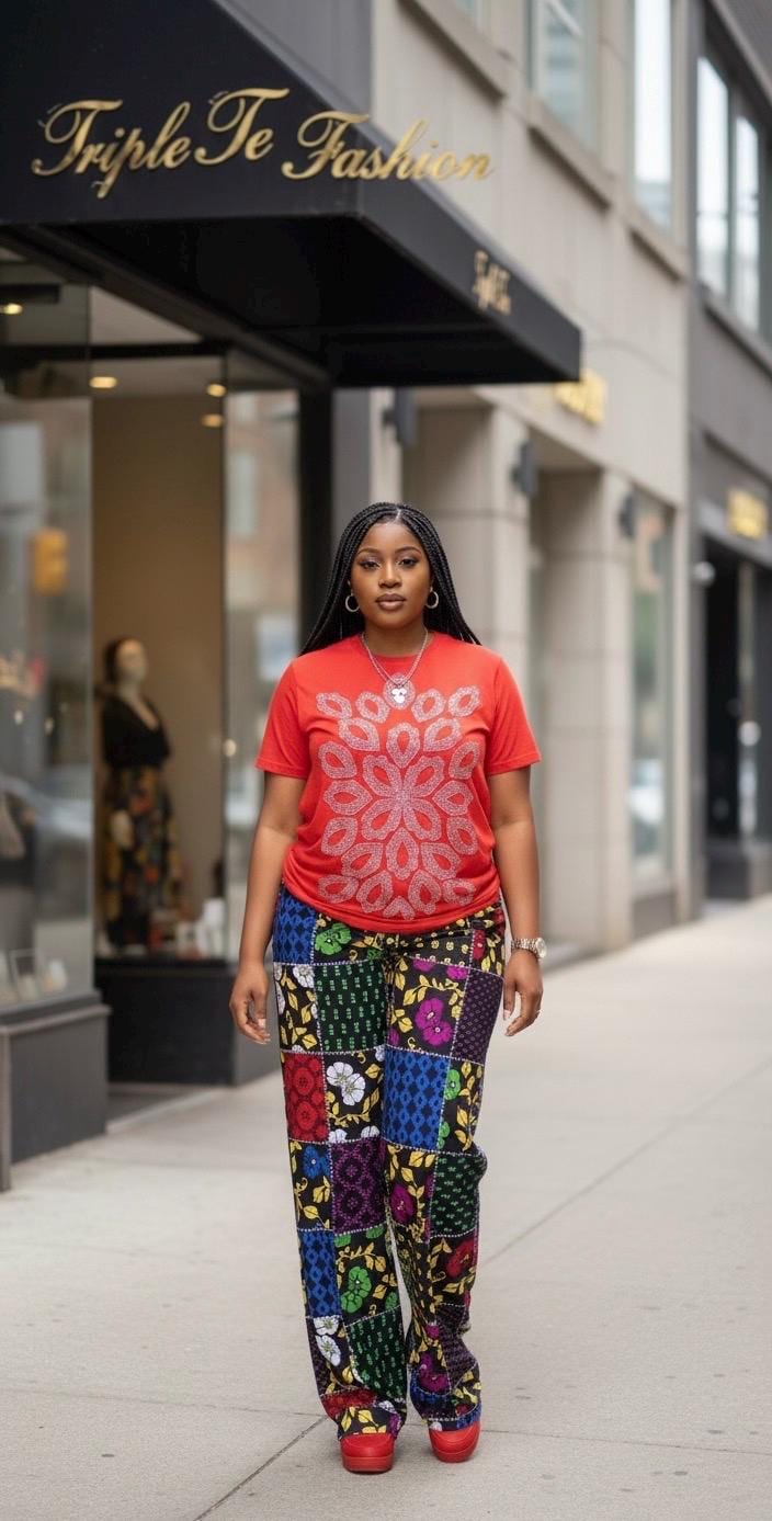 • Top: A red t-shirt, upgraded with a glittering centerpiece that pops with every move. • Bottoms: Wide-leg Ankara cotton pants, showcasing rich floral patterns and breathable comfort.