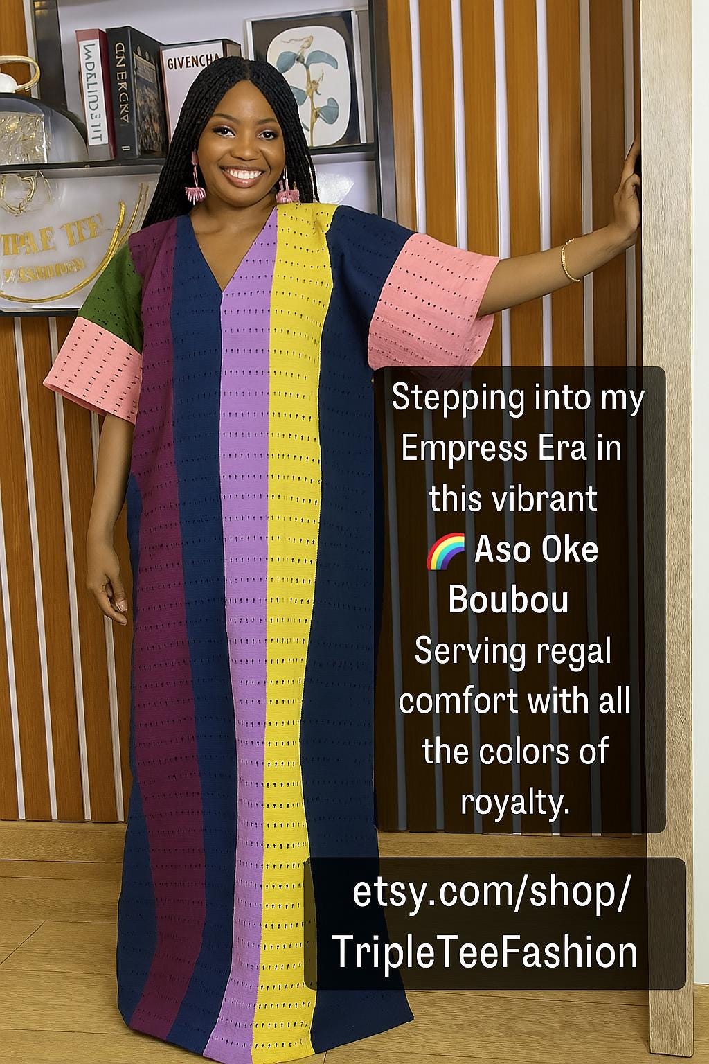 💫 **Details:** • Style: Aso Oke Boubou Maxi Dress • Size: One size fits most (S–XL) • Fabric: Authentic Aso Oke – thick, regal texture • Length: Approx. 60" • Includes optional headwrap upon request • Colors: May vary slightly due to handmade nature