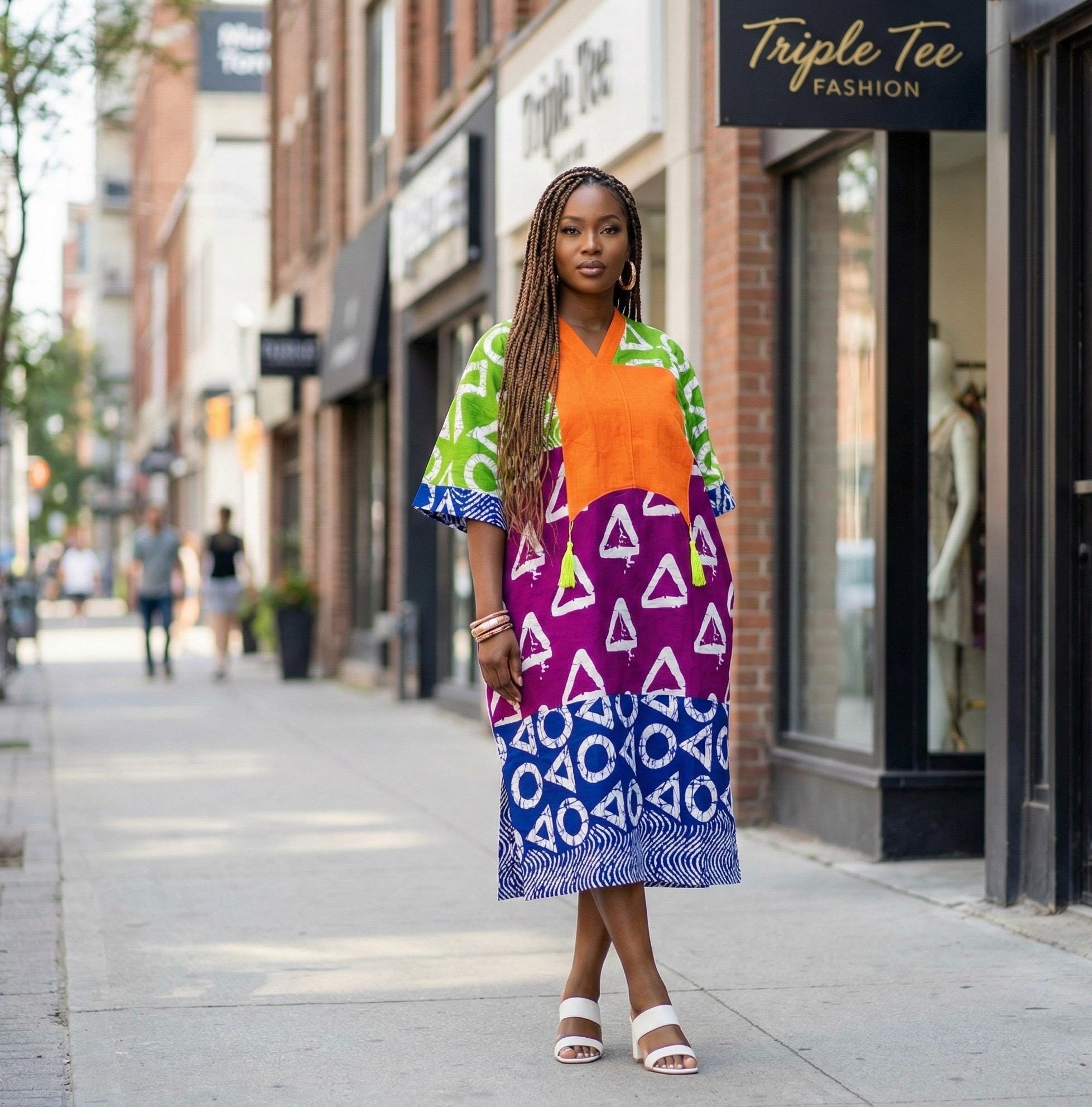 Step into vibrant style with this eye-catching African three-quarter sleeve dress, crafted from 100% cotton Ankara fabric and accented with rich Aso Oke at the neckline for a regal touch.