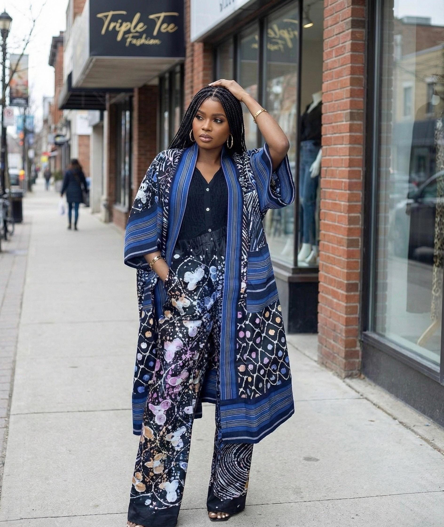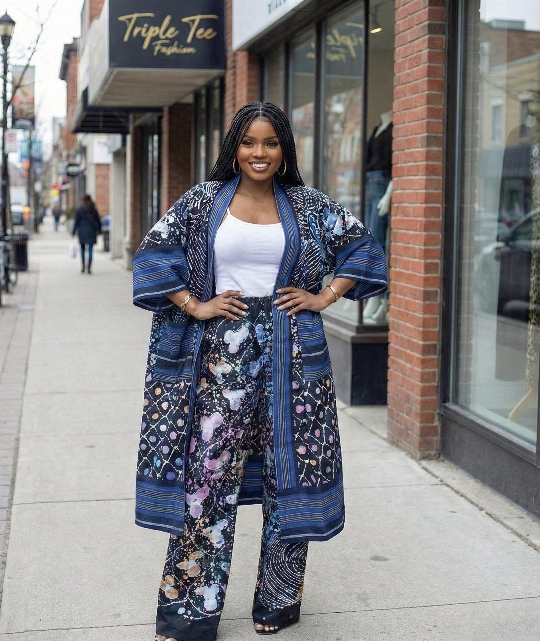• Flowing kimono jacket with open front styling • Matching wide-leg pants with adjustable rope tie waist • Beautifully hand-dyed adire paired with luxurious woven aso oke panels • Breathable and lightweight—perfect for any season • Fits women’s sizes 12–20 comfortably