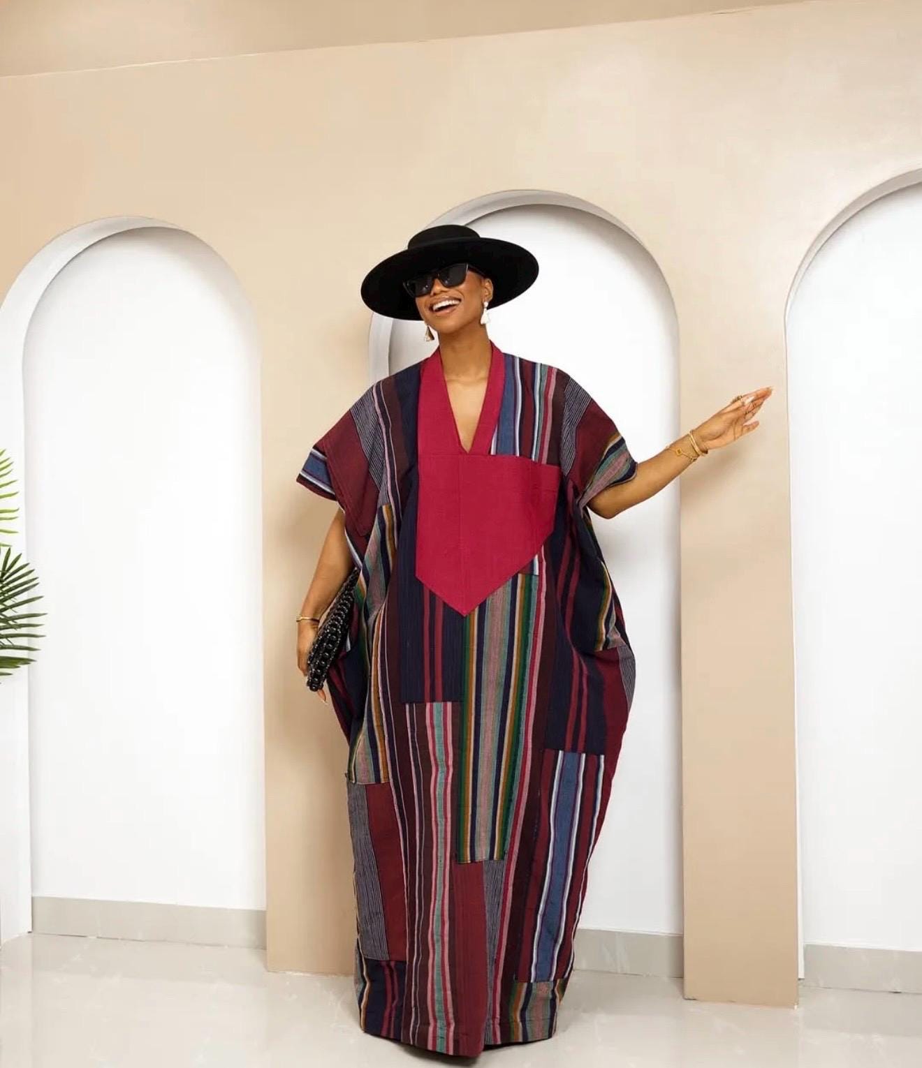 Elevate your wardrobe with this exquisite ASO OKE boubou kaftan, meticulously crafted to capture the essence of traditional Nigerian attire. Handmade from authentic ASO OKE sourced from Osogbo in Nigerian, each piece exudes quality and heritage.