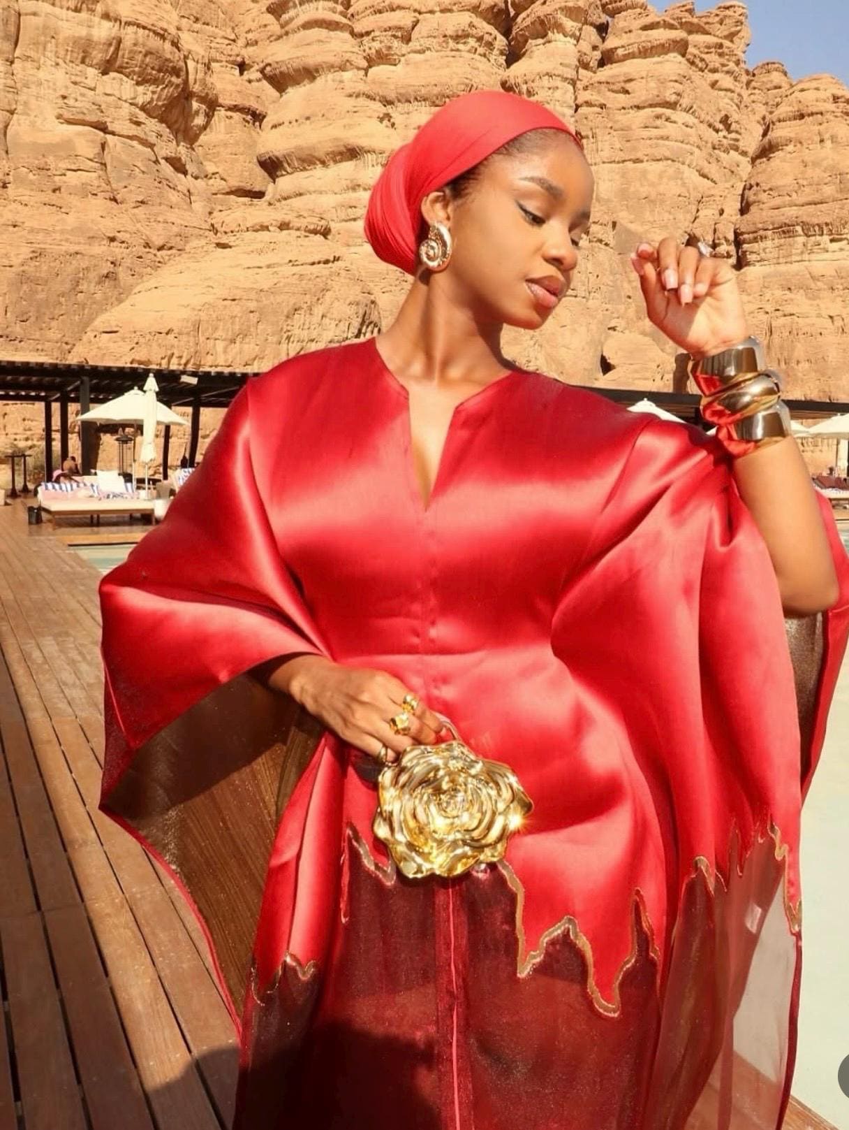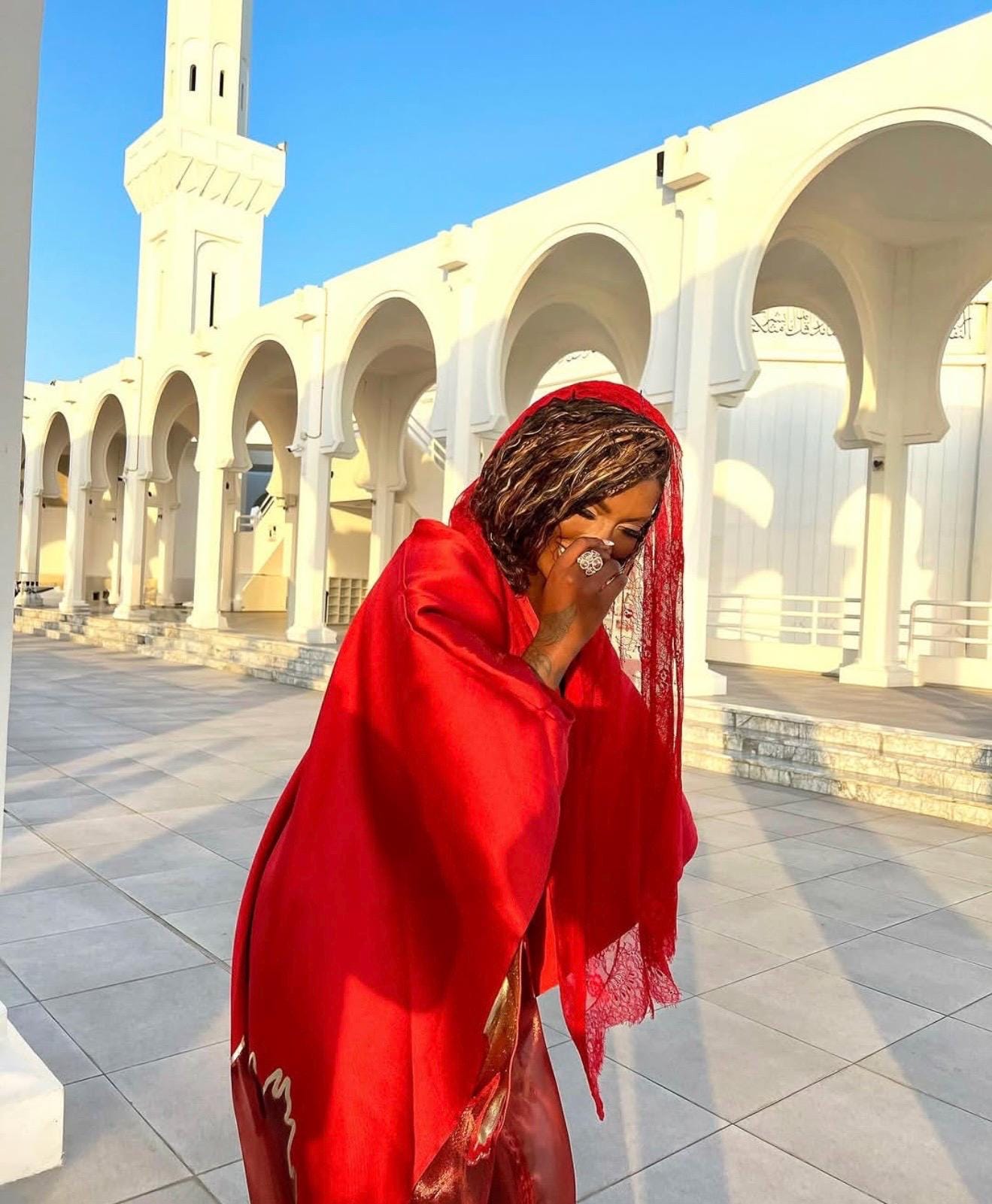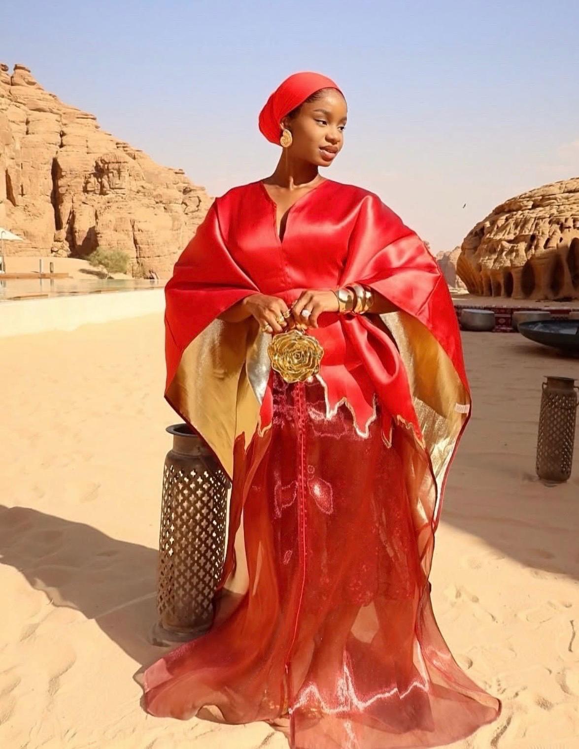 Step into the spotlight with this show-stopping boubou kaftan crafted from luxurious organza brocade—a fabric known for its lightweight structure, subtle sheen, and intricate woven patterns. This piece is designed to turn heads with its bold red and black motif, dramatic volume, and ethereal transparency.