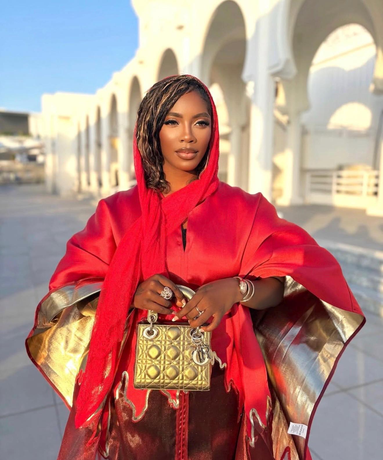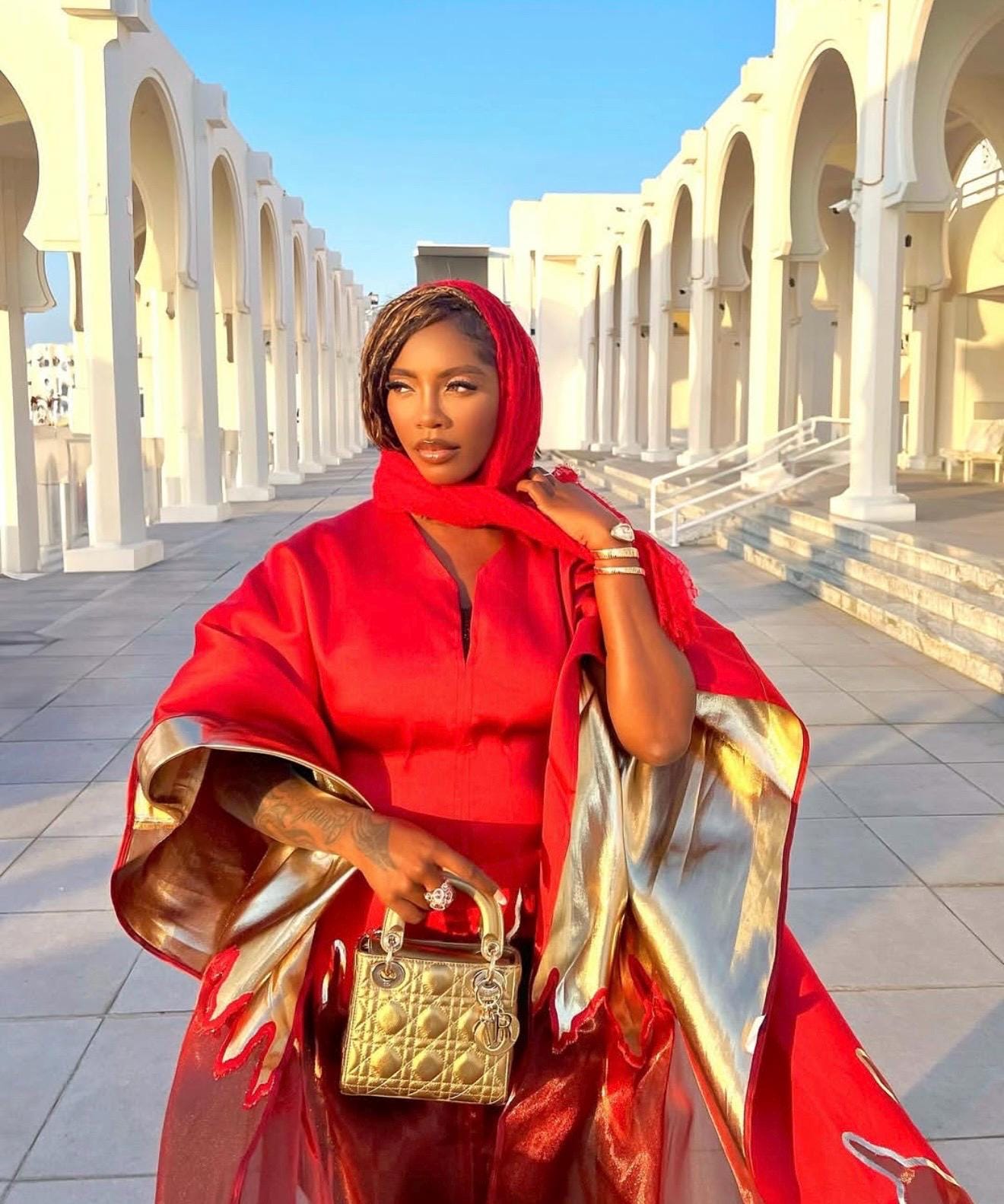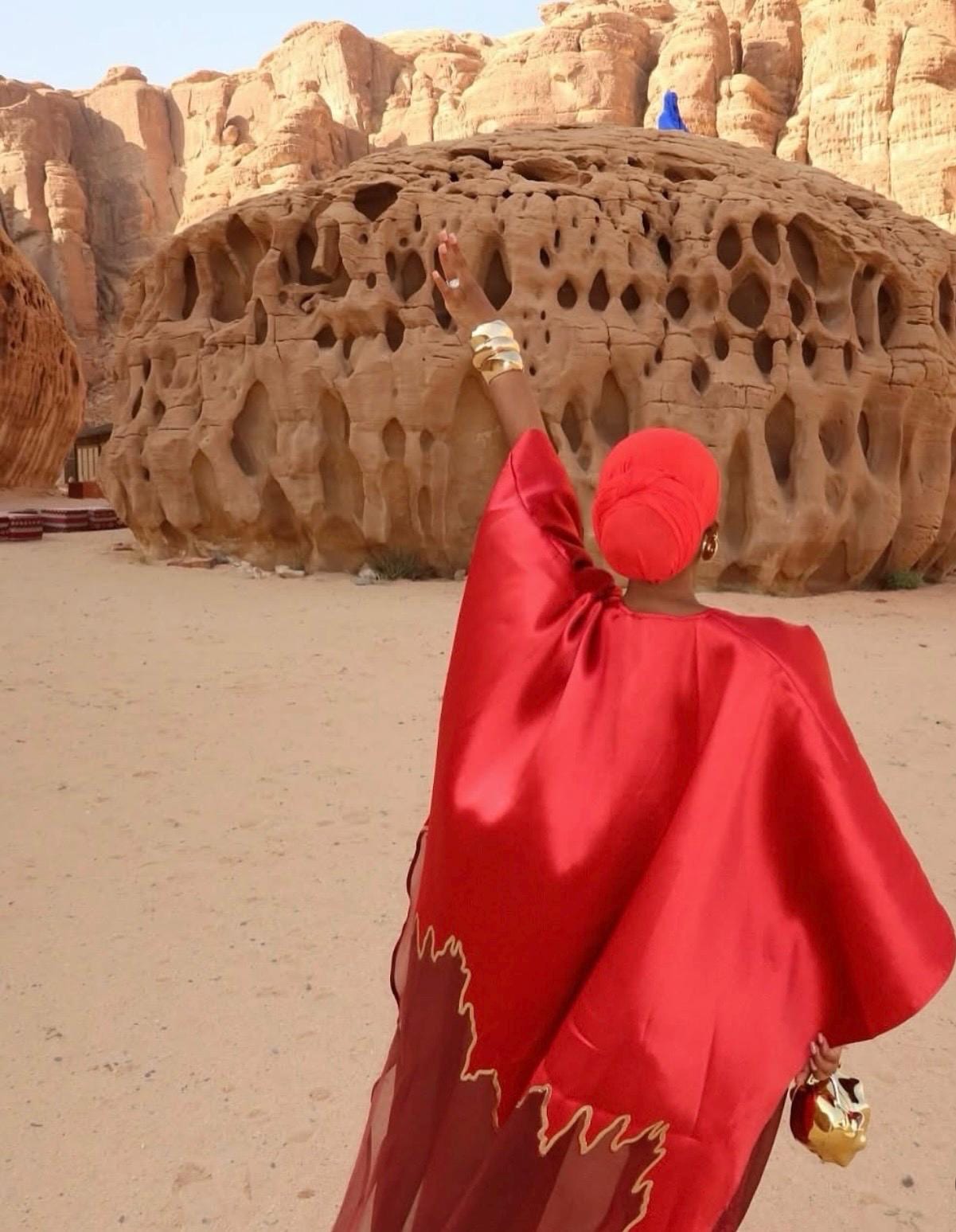 Step into the spotlight with this show-stopping boubou kaftan crafted from luxurious organza brocade—a fabric known for its lightweight structure, subtle sheen, and intricate woven patterns. This piece is designed to turn heads with its bold red and black motif, dramatic volume, and ethereal transparency.