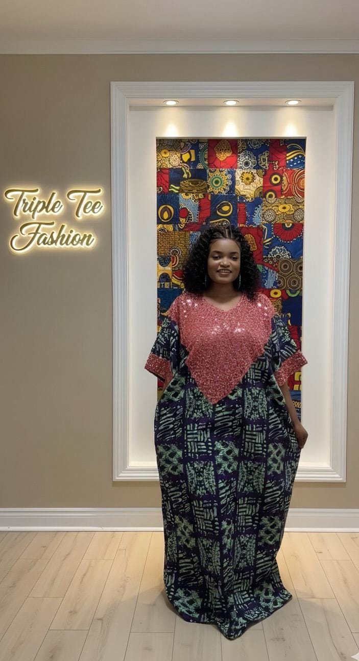 100% cotton. Made with African Ankara fabric and sequin. One size fits all. Ready made dresses. Lenght of this dress is 62 inches