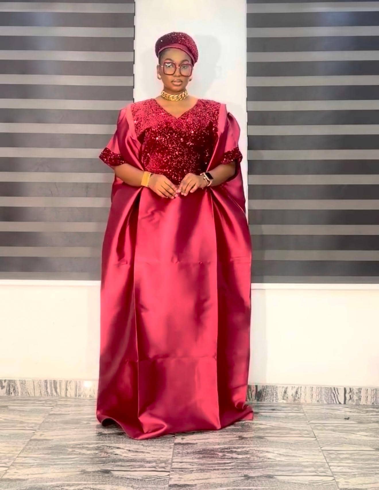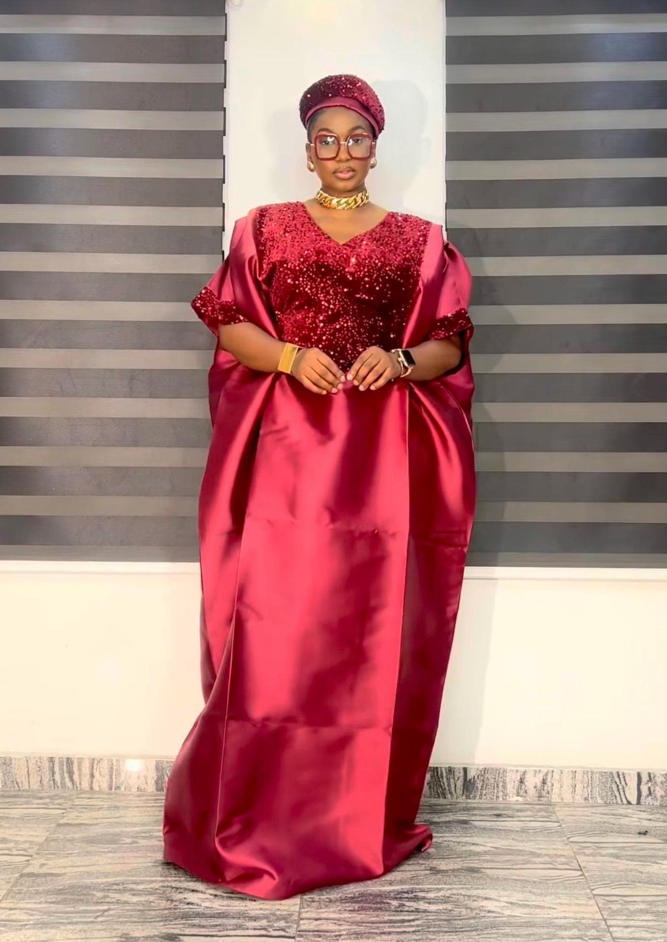 Burgundy Sequin Mikado Silk Boubou: African Kaftan Dress with Cap