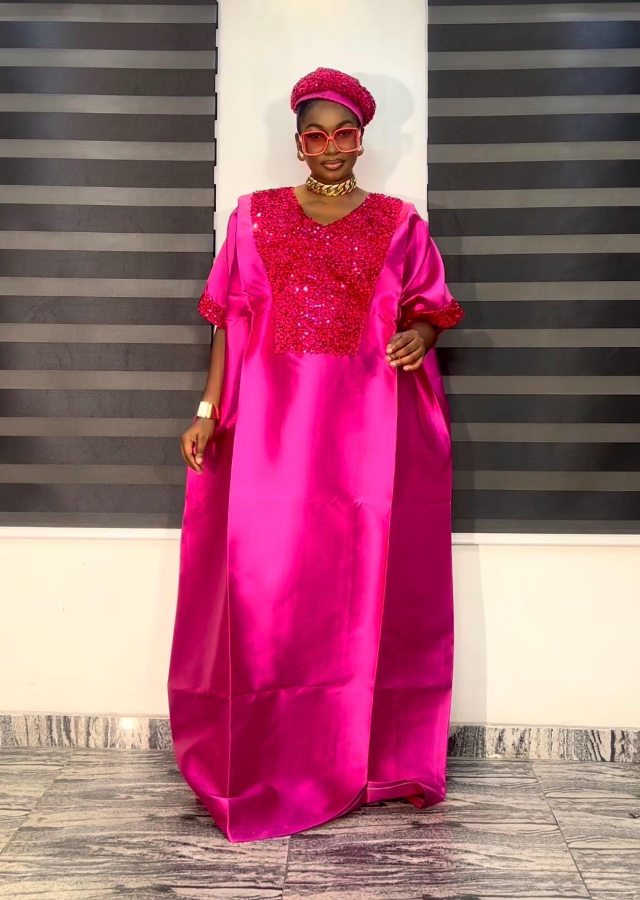 This boubou is a Luxury redefined. The celebrant worthy royal piece! One of our bestseller design! Our exquisite Mikado silk boubou, a pinnacle of elegance and luxury. Crafted from premium Mikado silk fabric and sequins in the neck area, renowned for its lustrous sheen and smooth texture, this boubou exudes sophistication and refinement.