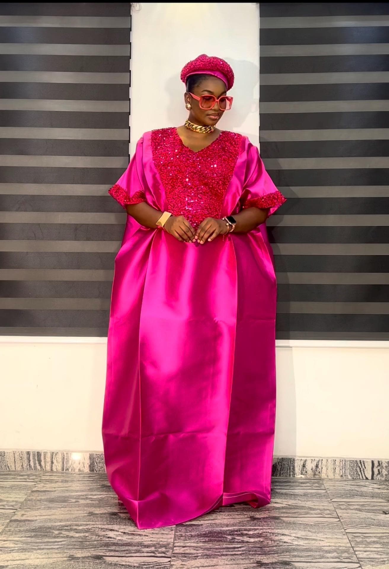 Outfit description - Made from mikado and Sequence. One size fits US size 8 to Size 24, It is a free size boubou. Comes with a cap to match.