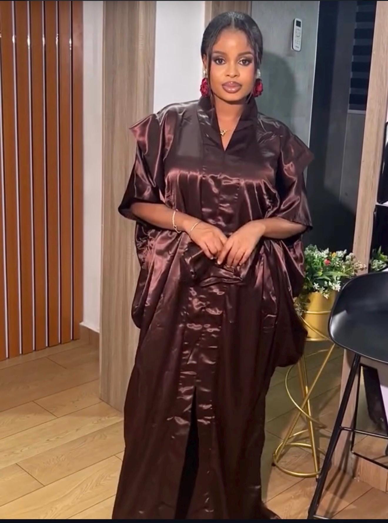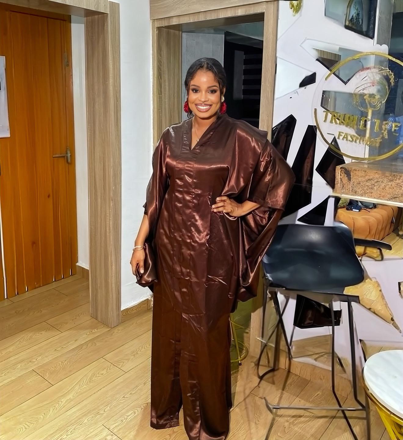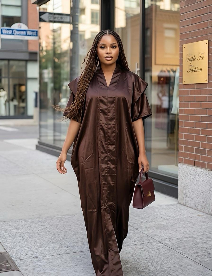 This beautiful dress is an irregular shaped boubou with an inner belt attached to make it fit. One size fits all. Can be worn in two ways; You can tie the inner belt to make it fitted or leave it as a boubou.