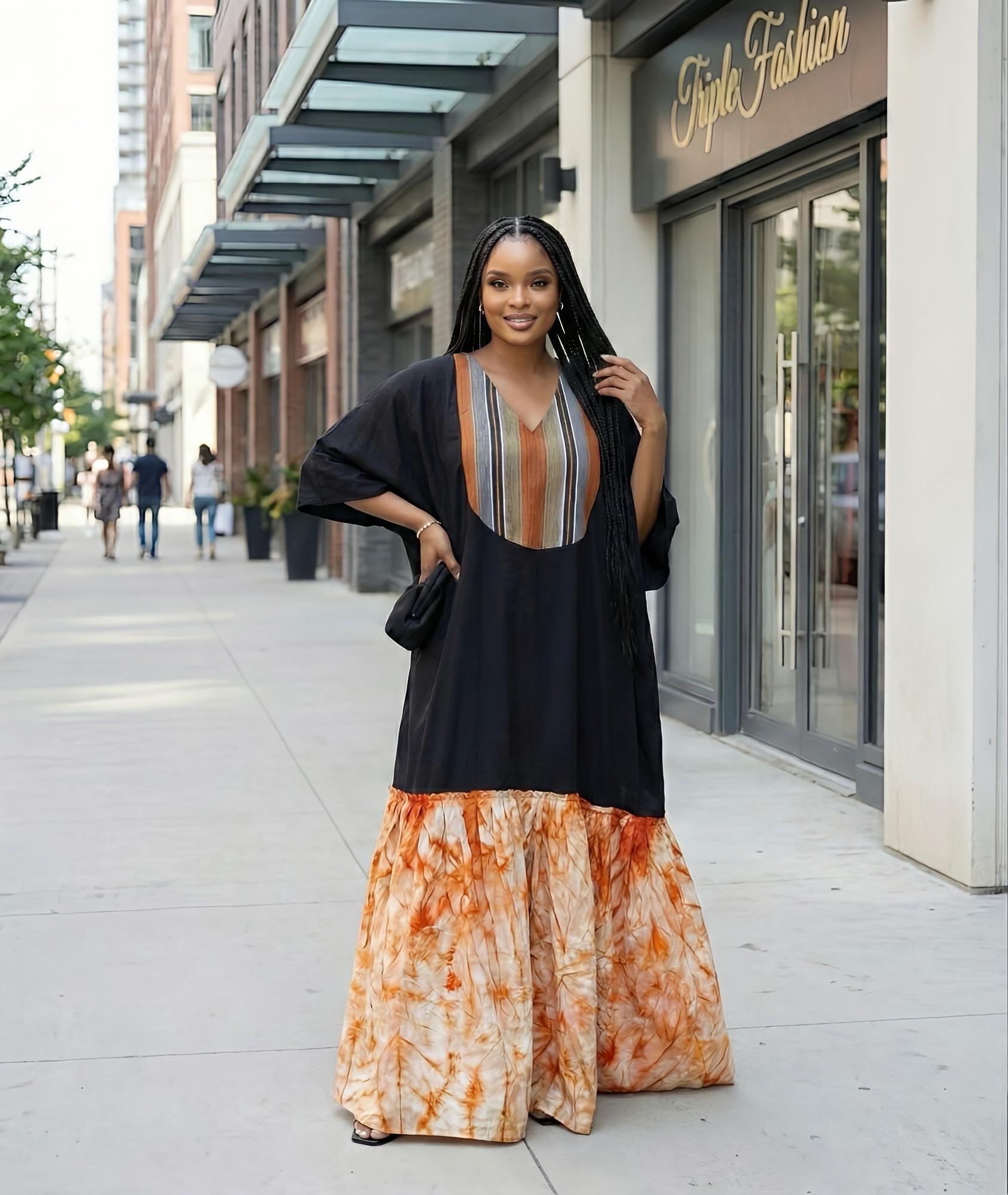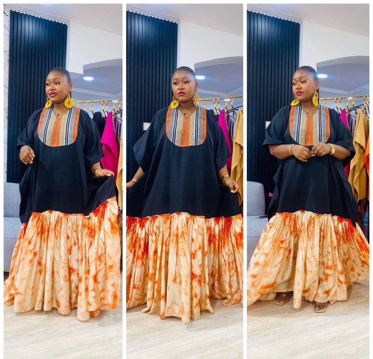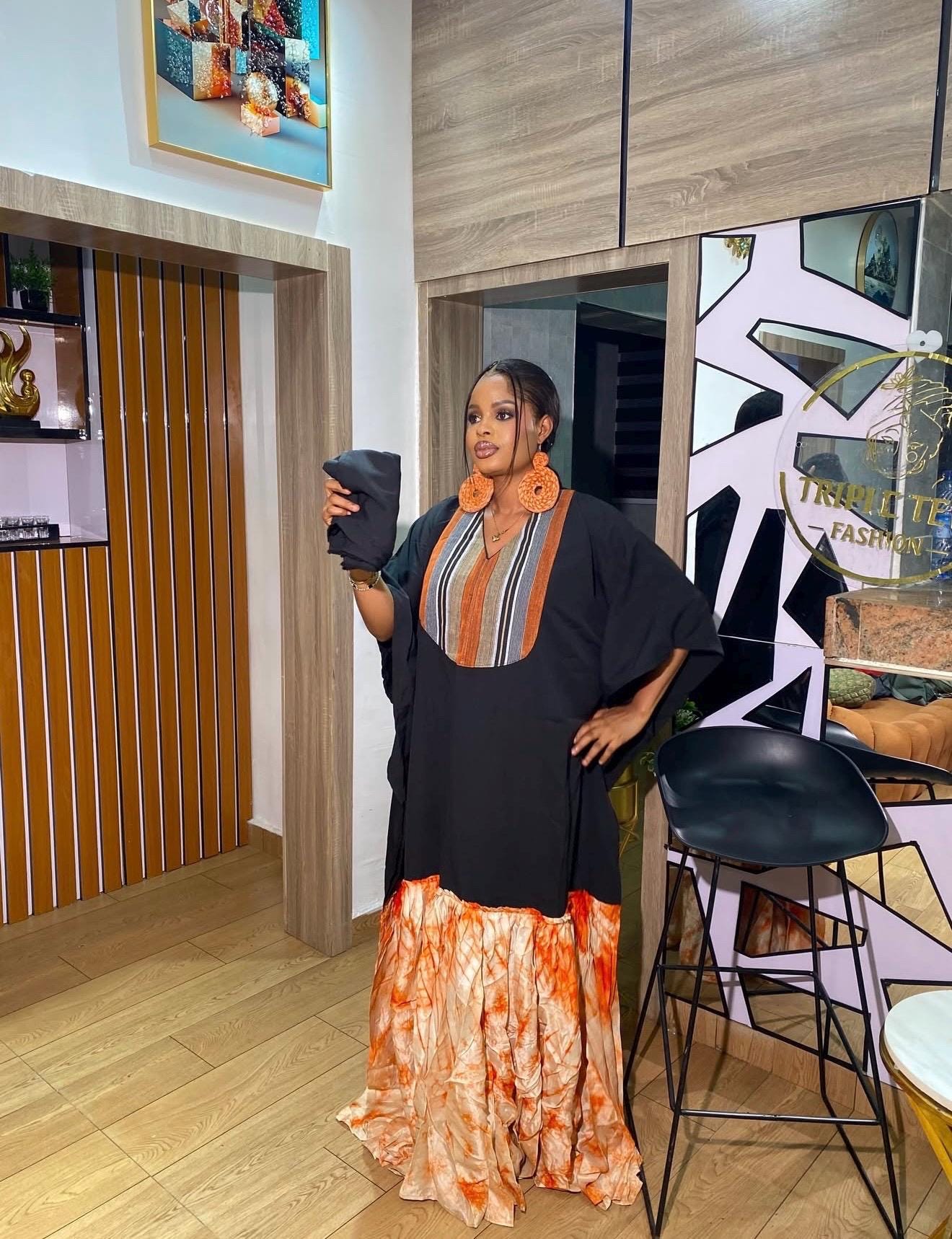 ✔ Luxurious Black Crepe fabric (soft, elegant drape) ✔ Authentic Aso Oke detail at the neck area ✔ Statement Adire Crepe design at the lower part ✔ Flowy and flattering boubou/kaftan silhouette ✔ Easy to dress up or down
