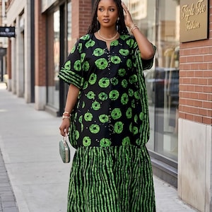 The outer layer, adorned with intricate Adire patterns created through traditional resist dyeing techniques, exudes cultural charm and authenticity. Paired with the Aso Oke, woven with exquisite craftsmanship, this boubou offers a luxurious blend of textures and colors.