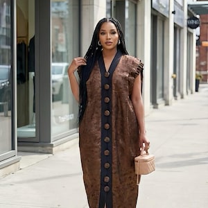 This beautiful dress is an irregular shaped boubou with an inner belt attached to make it fit. One size fits all. Can be worn in two ways; You can tie the inner belt to make it fitted or leave it as a boubou.