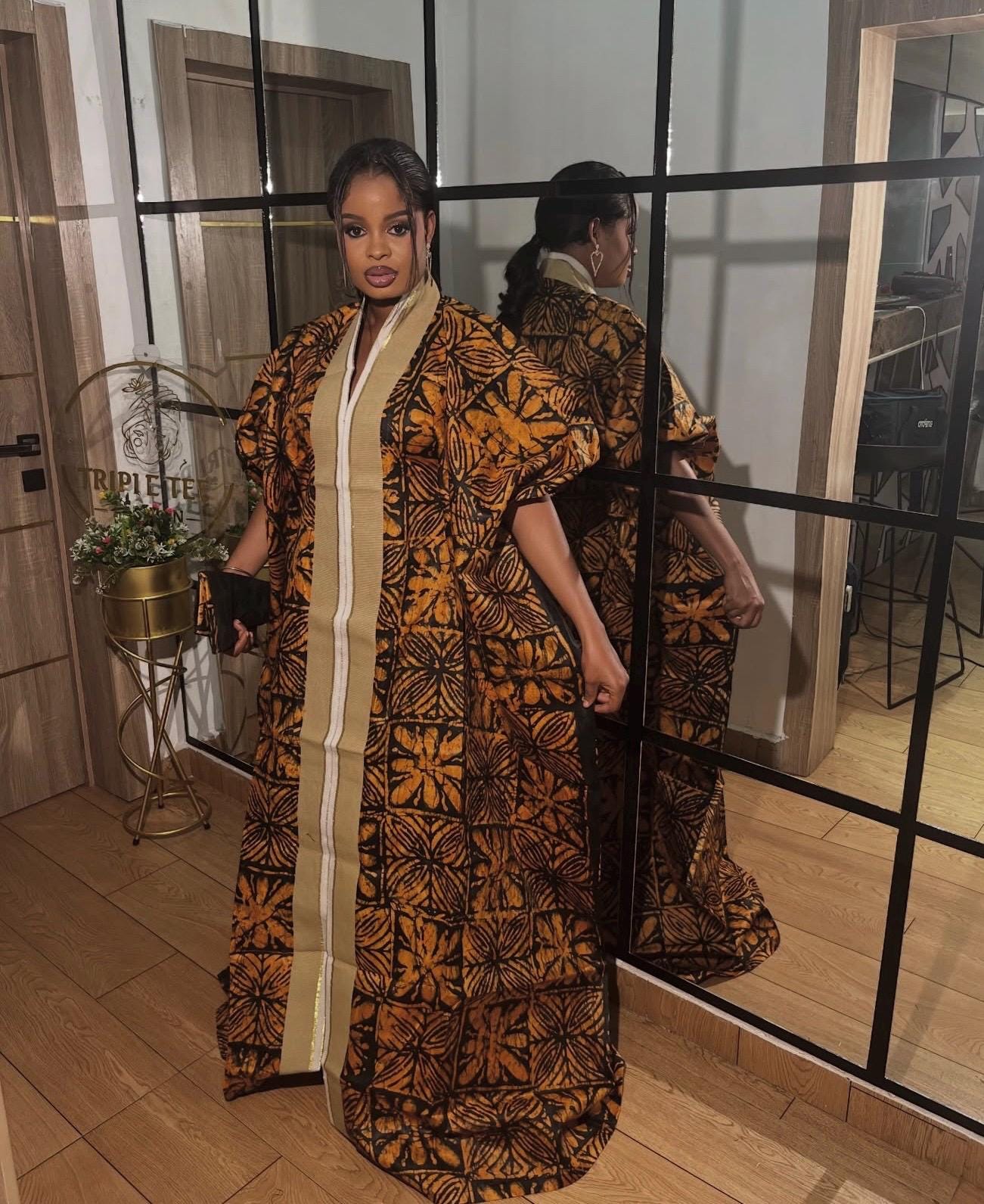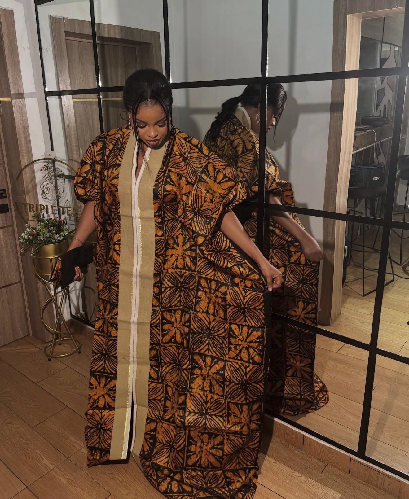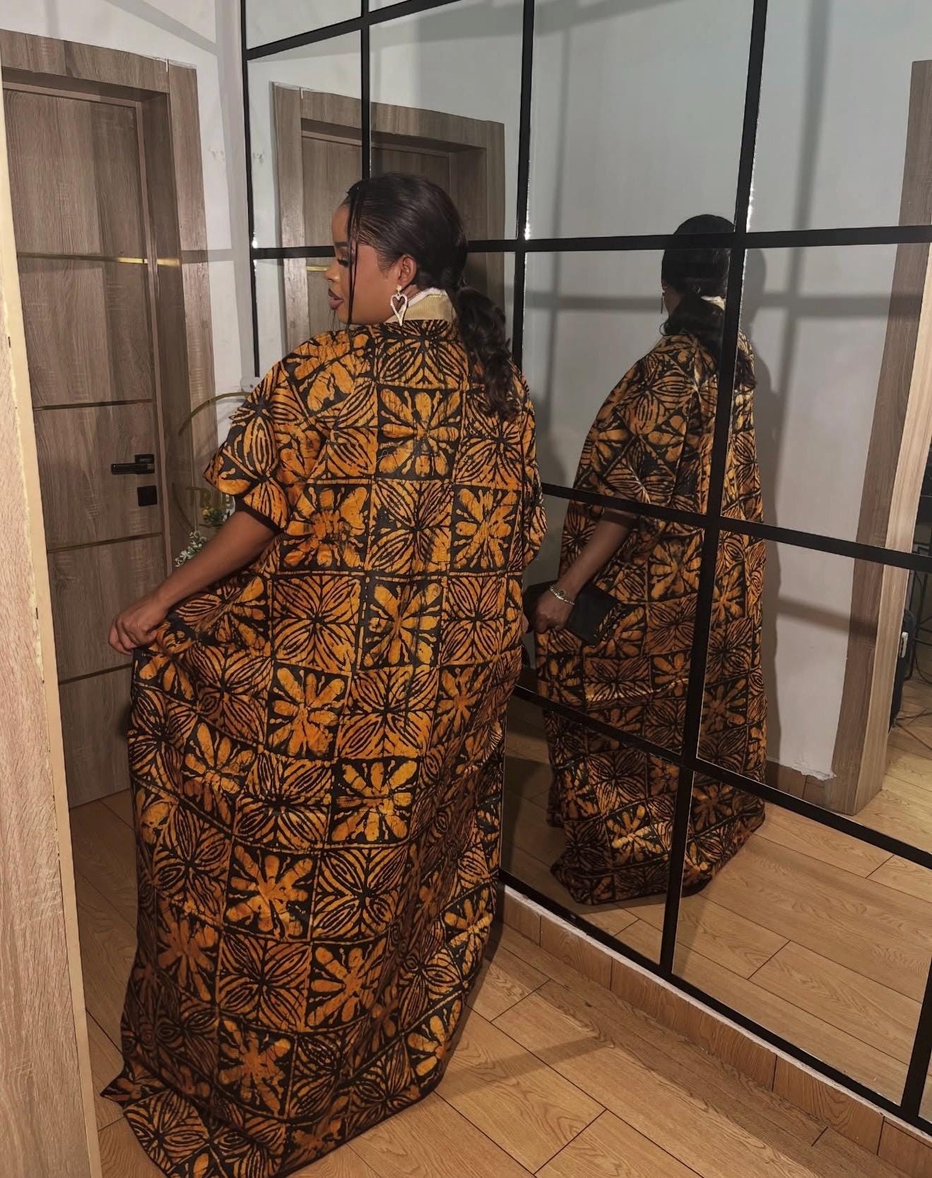 The outer layer, adorned with intricate Adire patterns created through traditional resist dyeing techniques, exudes cultural charm and authenticity. Paired with the Aso Oke, woven with exquisite craftsmanship, this boubou offers a luxurious blend of textures and colors.