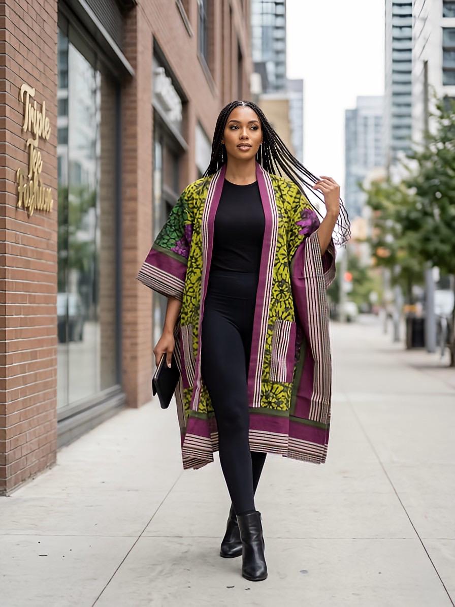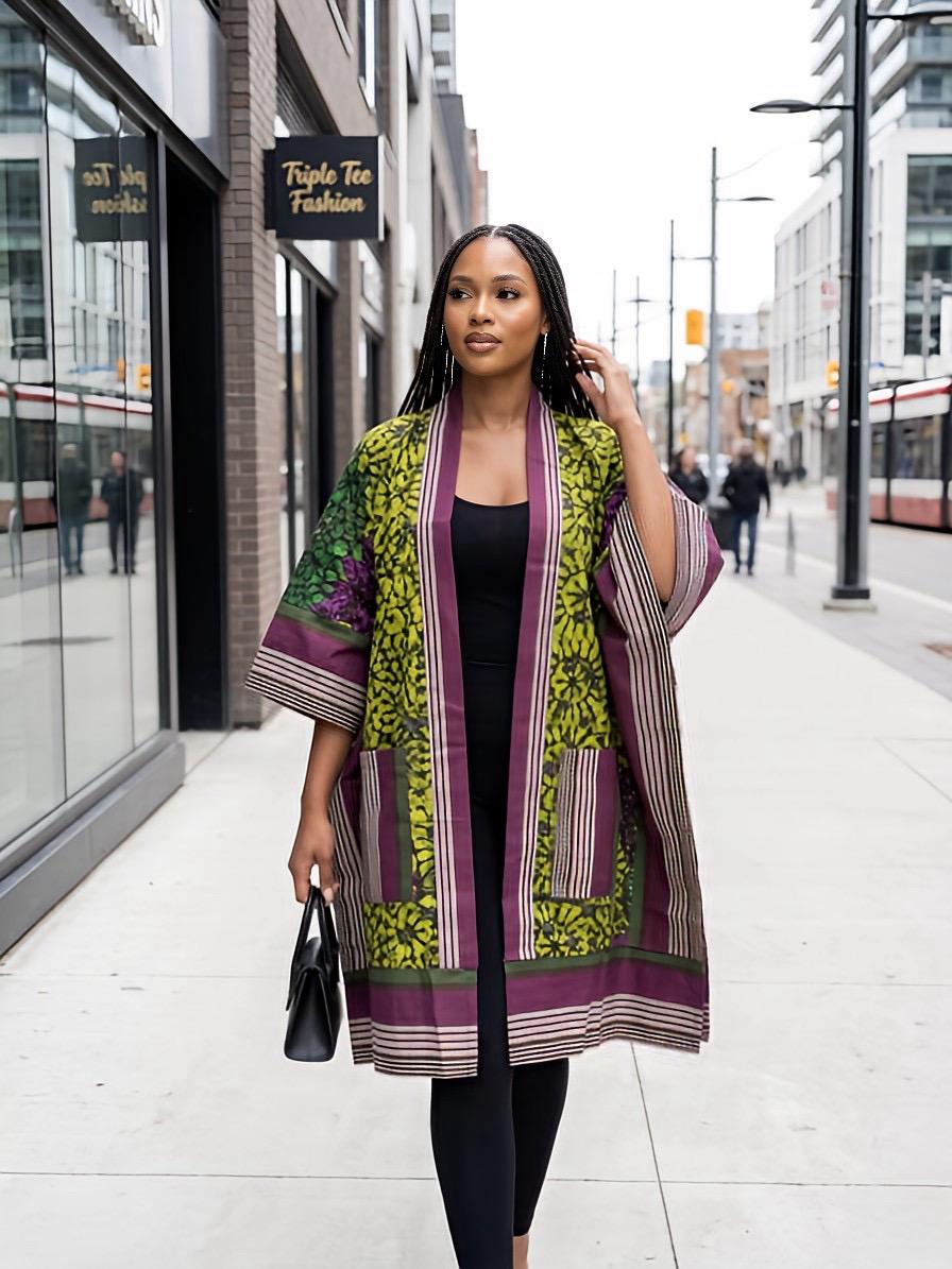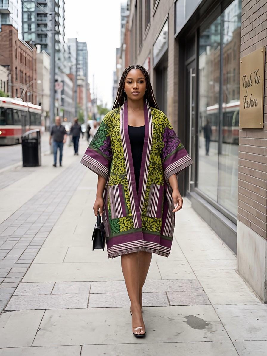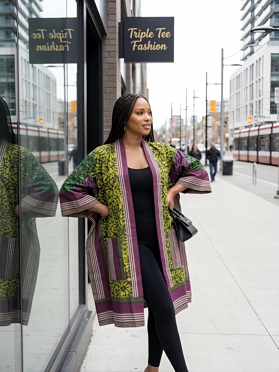 Embrace artisan elegance with this stunning handcrafted kimono jacket by Triple Tee Fashion. Beautifully marrying traditional Nigerian textile arts, this versatile duster features rich, hand-dyed Adire batik paired with striking, woven Aso-oke detailing along the lapel, hem, and pockets. Whether you're dressing up for a special event, stepping out in the city, or adding cultural flair to a casual jeans-and-tee outfit, this unique piece is the ultimate statement for your wardrobe. ✨ Key Features: • Artisan Fabrics: Authentic, hand-dyed Adire batik contrasted with textured, premium Aso-oke accents. Because the Adire is handmade, each jacket carries its own unique, beautiful dye pattern. • Functional Design: Features deep, roomy front pockets for convenience and a relaxed open-front silhouette. • Versatile Styling: Layer it effortlessly over leggings, jeans, a sleek bodycon dress, or wear it as a chic transitional coat. • Exceptional Craftsmanship: Carefully stitched to ensure durability, comfort, and a beautiful, natural drape. 📏 Sizing & Fit: • One Size Fits All: Designed with a generous, flowing cut that beautifully flatters a wide variety of body shapes and sizes. The relaxed fit ensures all-day comfort without sacrificing style. 🧼 Care Instructions: • Hand wash cold with mild soap to preserve the rich, hand-dyed colors. • Hang or line dry out of direct sunlight. Do not bleach. • Iron on the inside (wrong side) on medium heat. Elevate your everyday style with Triple Tee Fashion—where rich heritage meets modern street style.
