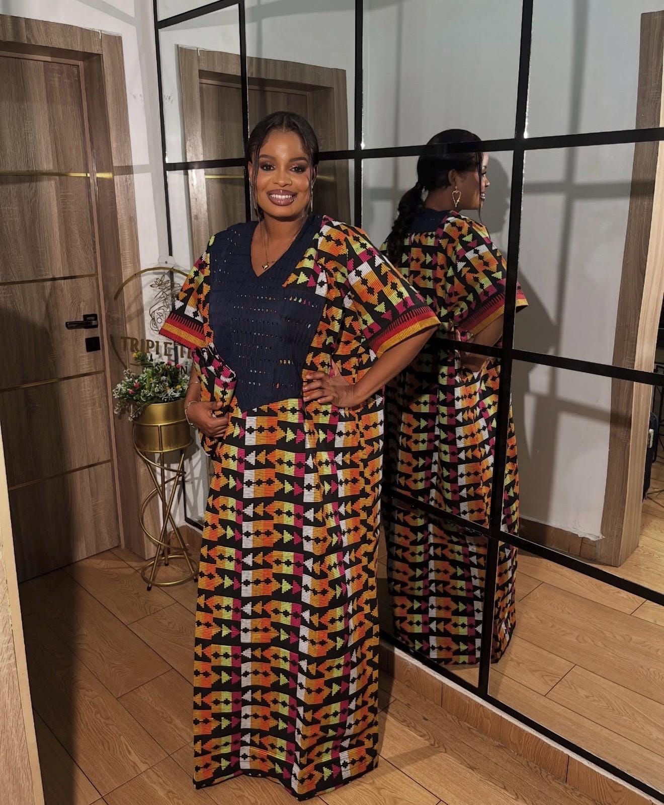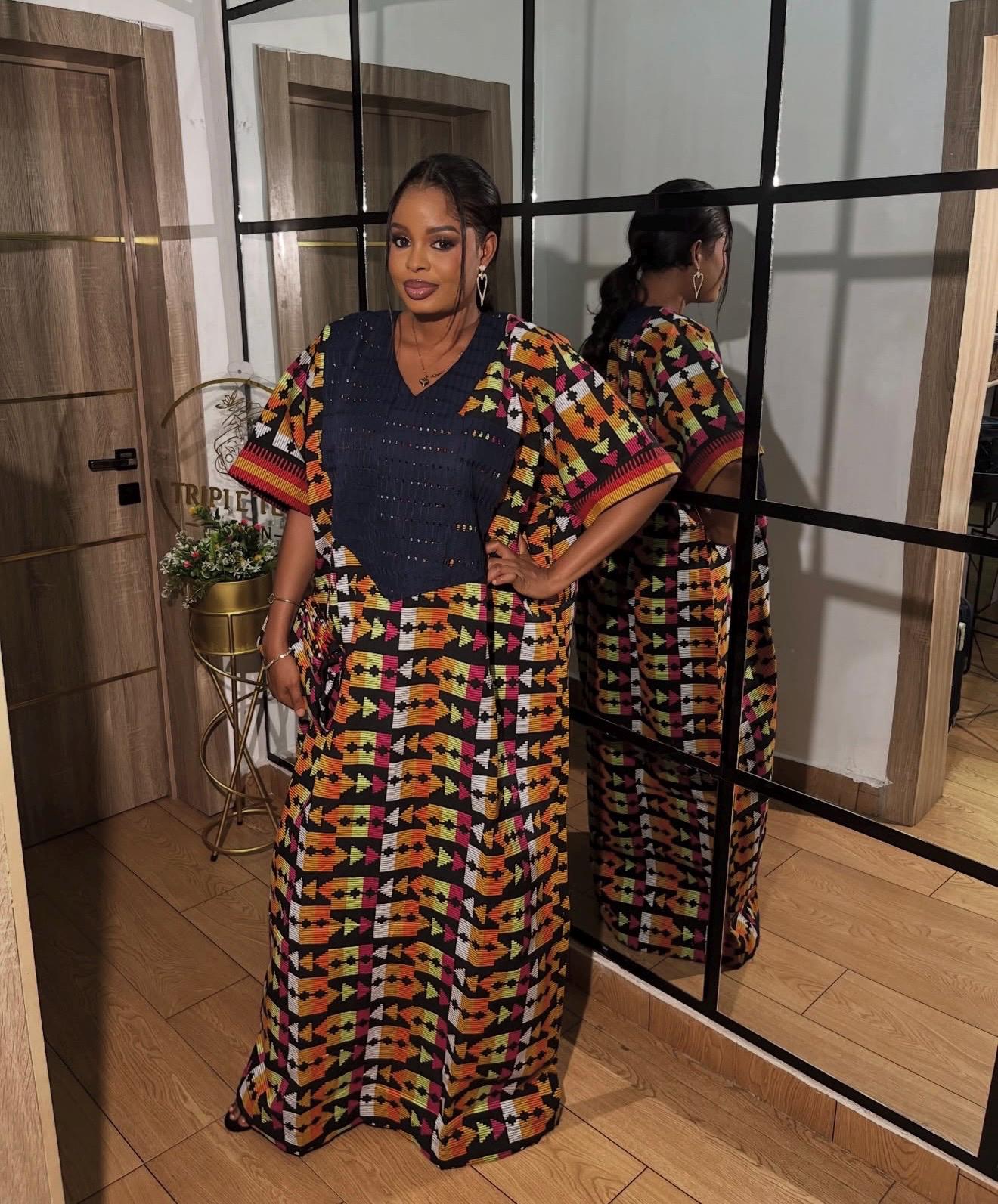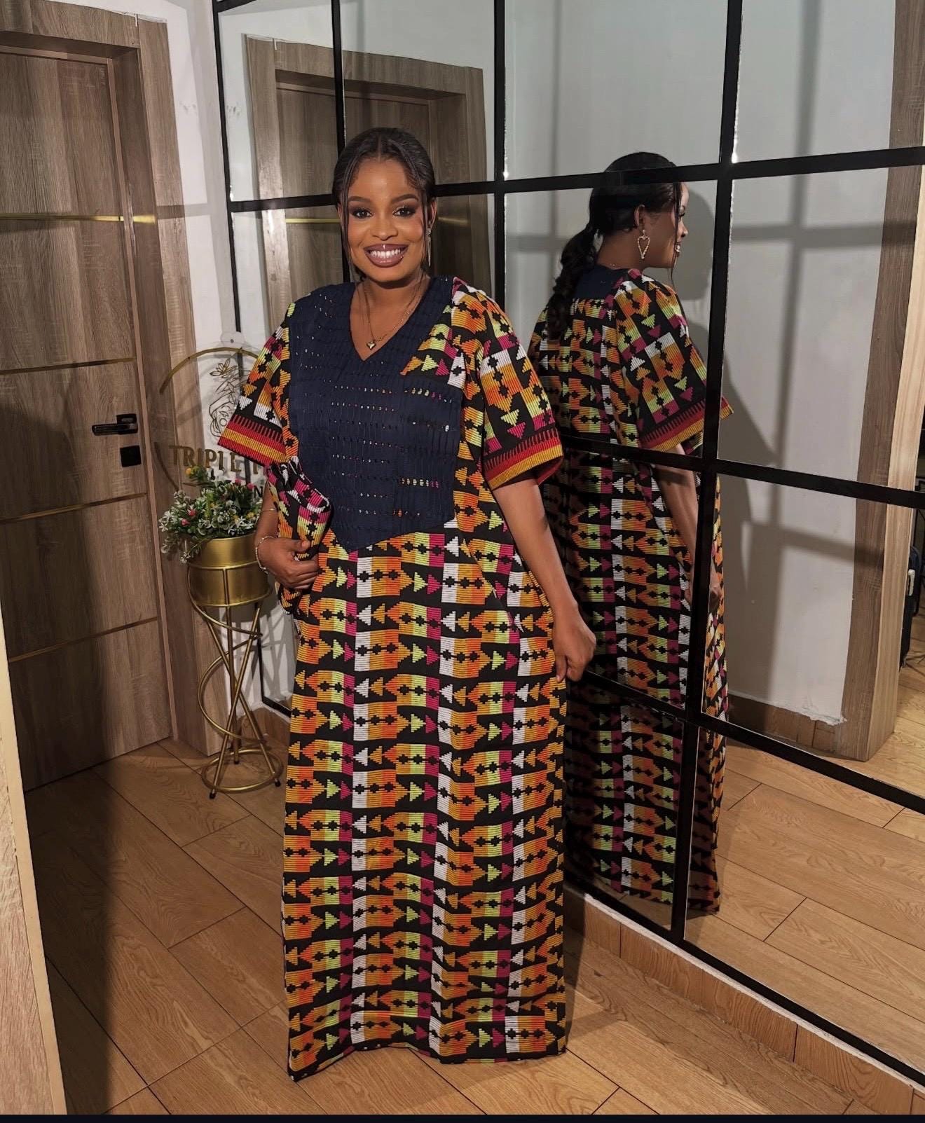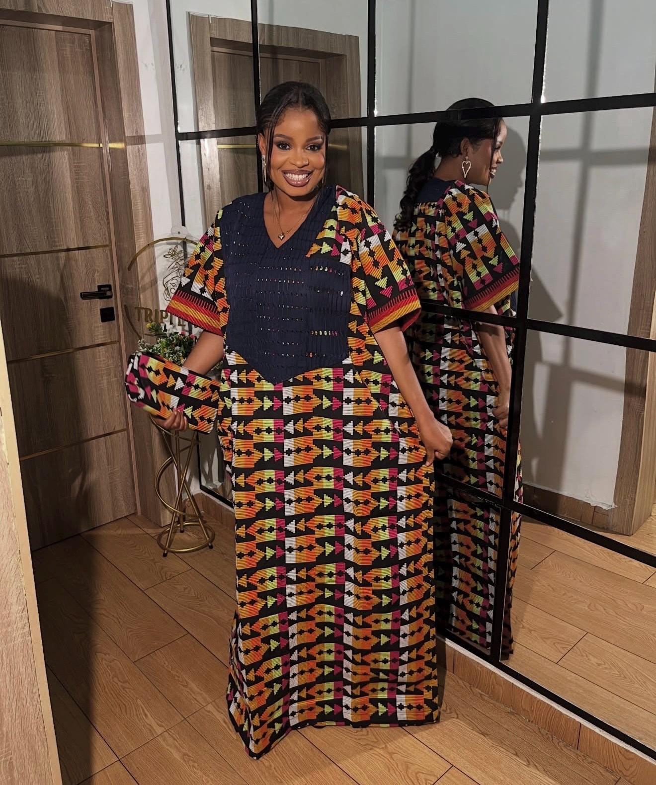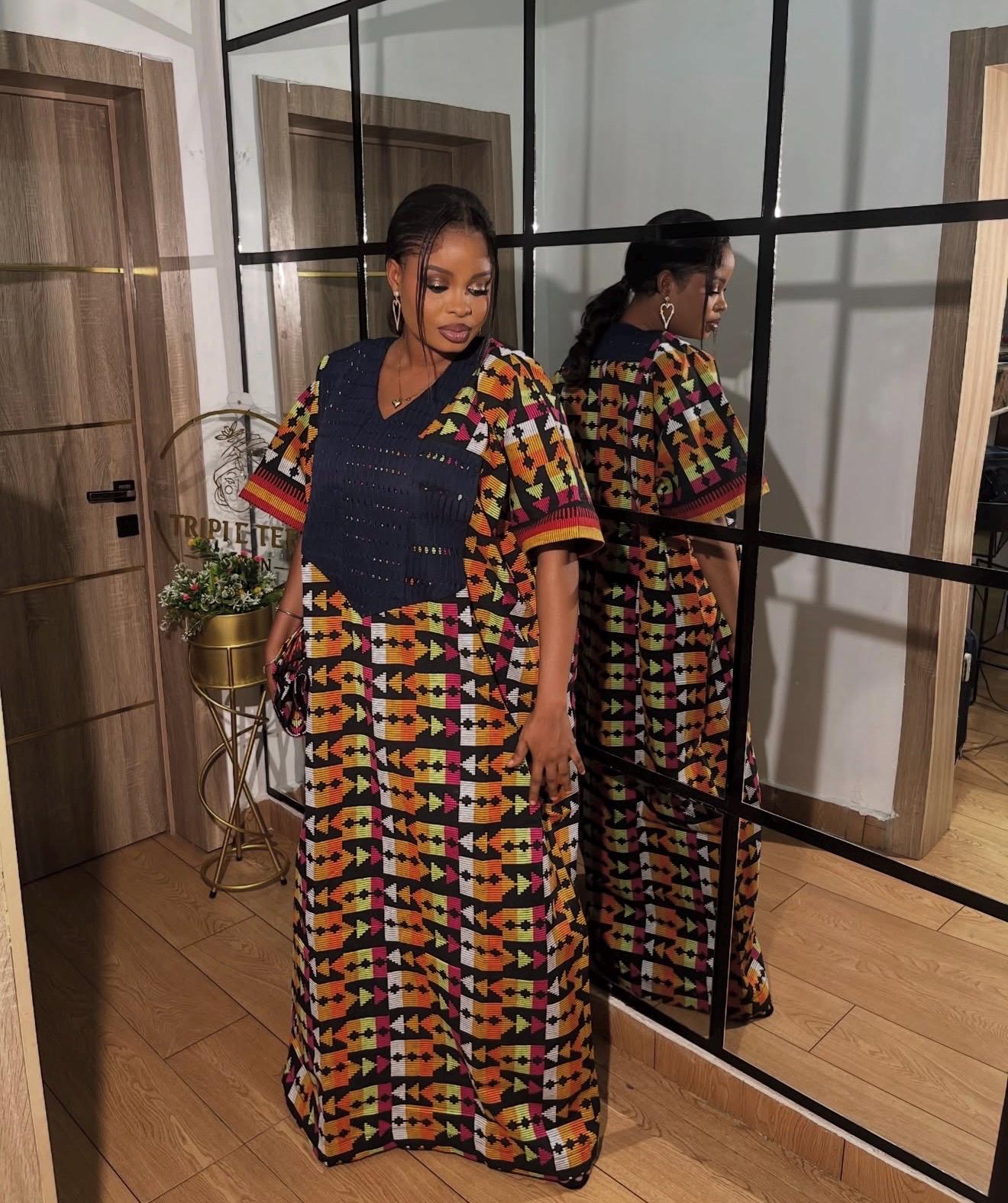 Make a bold cultural statement with this elegant Akwete and Aso Oke boubou dress, designed exactly as seen in the photos.